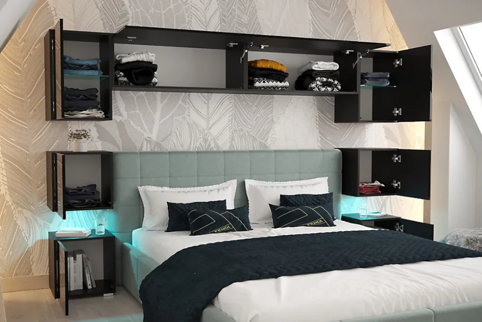 L’ensemble comprend : composition de 8 armoires de rangement Dimensions : – Largeur : 240 cm – Hauteur : 182 cm – Profondeur : 35 cm Toutes les dimensions détaillées dans les images du produit Matériaux: – Structure en panneau de particules – Façades en MDF, feuille de finition brillant NON LAQUÉE Couleur : noir et noir brillant * Ensemble vendu sans lit * Les lumières LED ne sont pas incluses