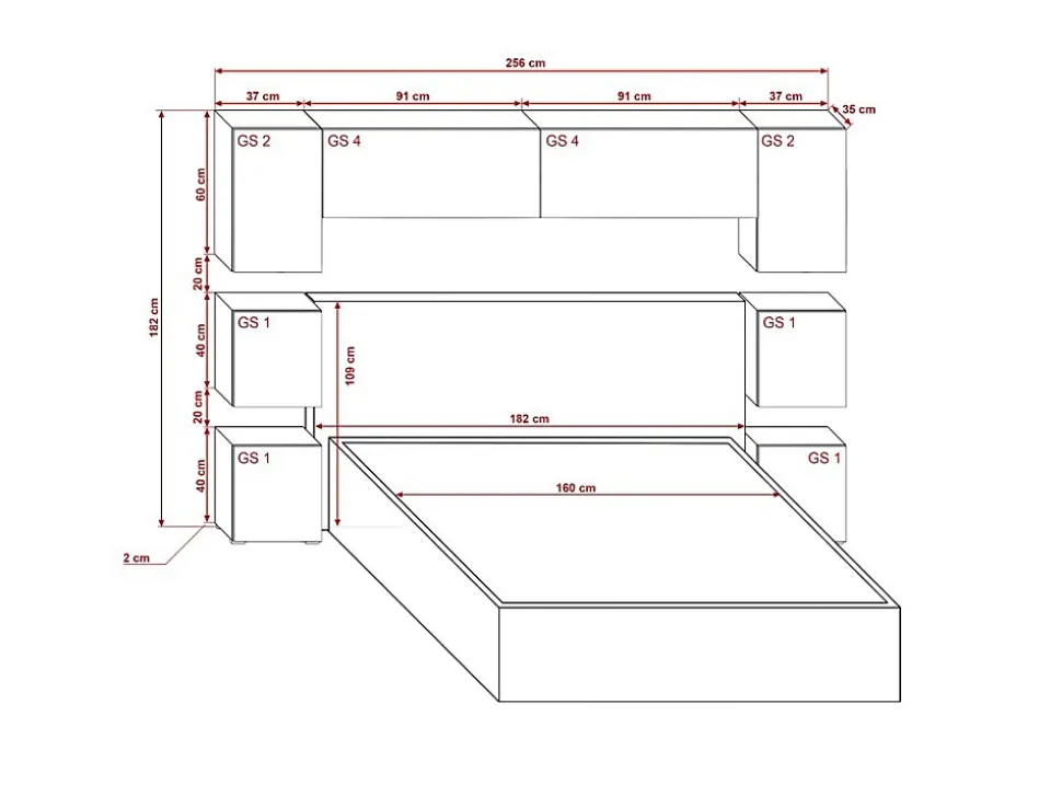L’ensemble comprend : composition de 8 armoires de rangement Dimensions : – Largeur : 256 cm – Hauteur : 182 cm – Profondeur : 35 cm Toutes les dimensions détaillées dans les images du produit Matériaux: – Structure en panneau de particules – Façades en MDF, feuille de finition brillant NON LAQUÉE Couleur : blanc et blanc brillant * Ensemble vendu sans lit * Les lumières LED ne sont pas incluses