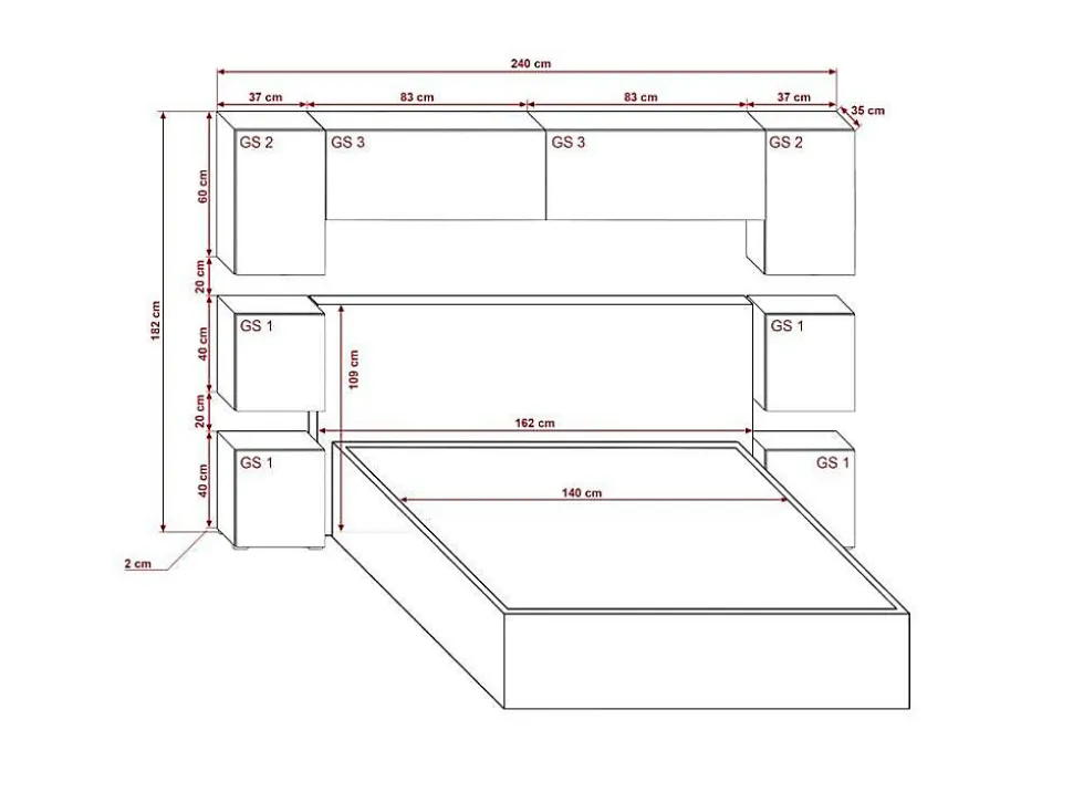 L’ensemble comprend : composition de 8 armoires de rangement Dimensions : – Largeur : 240 cm – Hauteur : 182 cm – Profondeur : 35 cm Toutes les dimensions détaillées dans les images du produit Matériaux: – Structure en panneau de particules – Façades en MDF, feuille de finition brillant NON LAQUÉE Couleur : blanc et blanc brillant * Ensemble vendu sans lit * Les lumières LED ne sont pas incluses