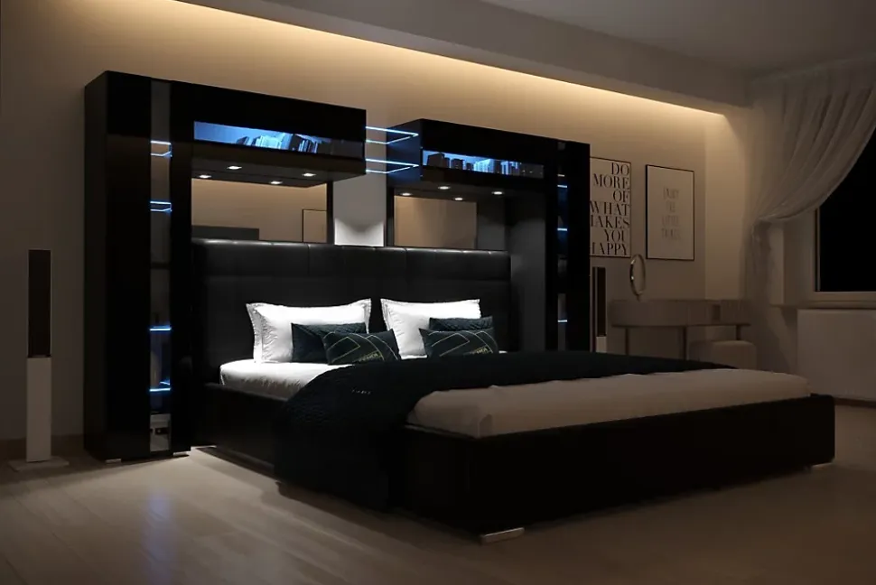 L’ensemble comprend : structure de rangement Dimensions : – Largeur : 290,6 cm – Hauteur : 184 cm – Profondeur : 35 cm Toutes les dimensions détaillées dans les images du produit Matériaux: – Structure en panneau de particules – Façades en MDF, feuille de finition brillant NON LAQUÉE Couleur : noir et noir brillant * Ensemble vendu sans lit * Les lumières LED ne sont pas incluses