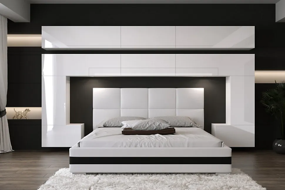 L’ensemble comprend : structure composée de 10 armoires de rangement Dimensions : – Largeur : 300 cm – Hauteur : 214 cm – Profondeur : 35 cm Toutes les dimensions détaillées dans les images du produit Matériaux: – Structure en panneau de particules – Façades en MDF, feuille de finition brillant NON LAQUÉE Couleur : blanc et blanc brillant * Ensemble vendu sans lit