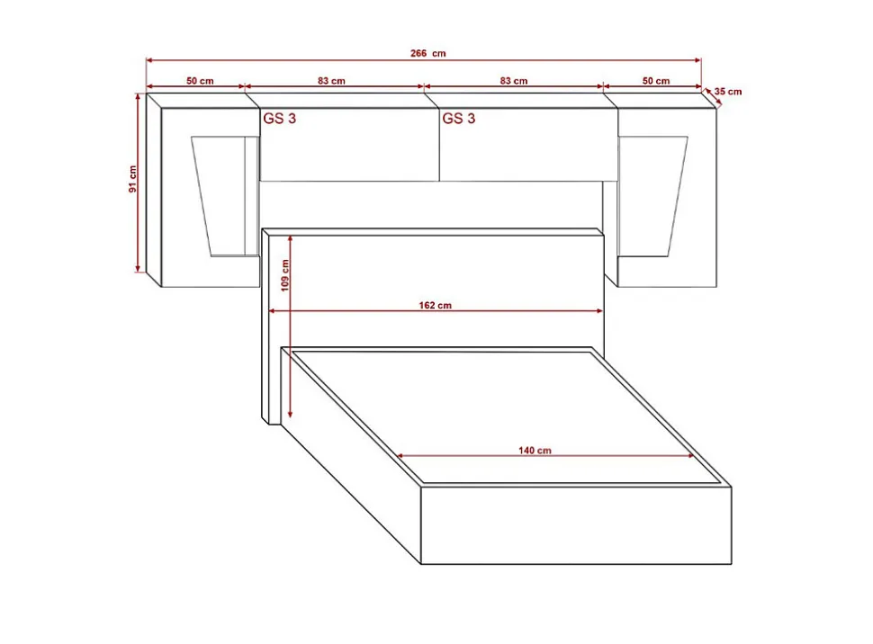 L’ensemble comprend : structure murale composée de 4 armoires de rangement Dimensions : – Largeur : 266 cm – Hauteur : 91 cm – Profondeur : 35 cm Toutes les dimensions détaillées dans les images du produit Matériaux: – Structure en panneau de particules – Façades en MDF, feuille de finition brillant NON LAQUÉE Couleur : blanc et blanc brillant * Ensemble vendu sans lit * Les lumières LED ne sont pas incluses