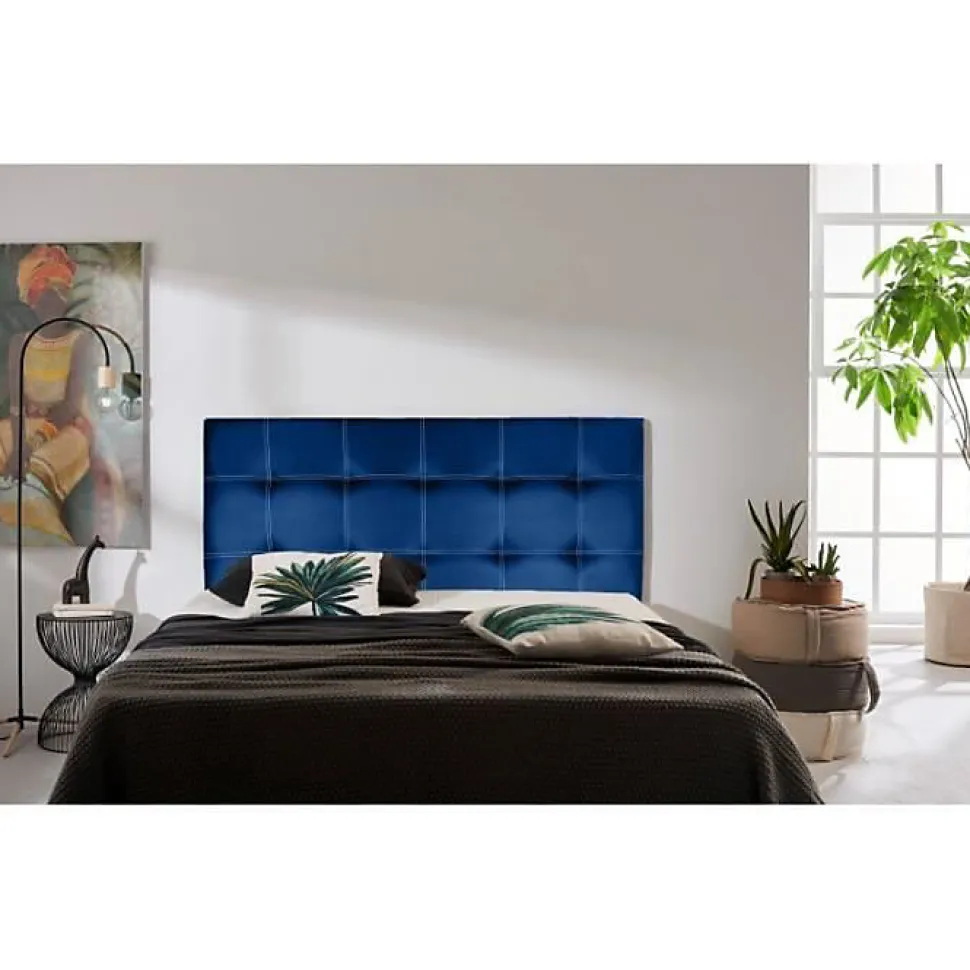 Tête de lit Iris en similicuir bleu de 115 cm, alliant élégance et confort. Fabriquée à la main avec un rembourrage en mousse HR, elle apporte une atmosphère chaleureuse à votre chambre. Durable grâce à sa structure en pin de Galice, elle inclut le matériel de montage. Garantie 2 ans. Fabriqué en Espagne.
