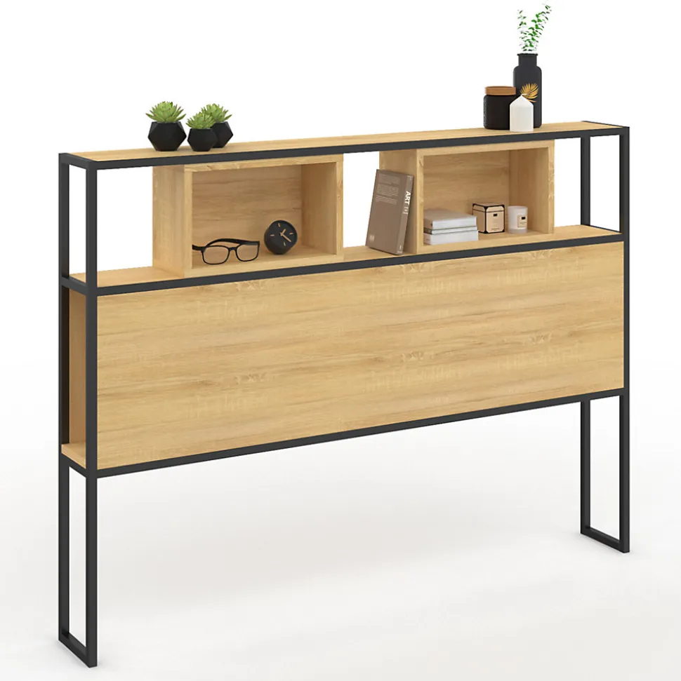 Simple et moderne, avec son design sobre et épuré, la tête de lit DETROIT s’intégrera parfaitement à votre chambre à coucher !Le contraste esthétique entre la couleur bois de la structure et le coloris noir du métal habillera joliment votre lit avec élégance et modernité.Astucieuses et fonctionnelles, ses niches supérieures et latérales vous permettront d’organiser le rangement de vos affaires personnelles pour une chambre dégagée et zen en toutes circonstances. Pratiques et déco, rangez-y votre montre, livre de chevet, réveil, pilulier, produits de nuit, sans avoir à vous relever !Stables et robustes, ses pieds contemporains en métal noir lui confèrent une allure brute esprit factory. Compatible avec les lits 160 cm, cette tête de lit ne nécessite pas de fixation murale et peut donc être installée partout et facilement, un atout supplémentaire pour cette tête de lit au style unique !Conçus pour apporter une touche de modernité aux petits comme aux plus grands espaces.Dimensions de la tête de lit DETROIT- Dimensions totales hors tout : Longueur 163 CM x largeur 18 CM x Hauteur 120 CM- Dimensions des 2 niches supérieurs : Longueur 37 x Profondeur 18 x Hauteur 24.5 CM- Dimensions des niches latérales : Longueur 16 x Profondeur 25 x Hauteur 41 CM- Hauteur par rapport au sol : 45 CMRetrouvez également le format pour lit 140 CM ainsi que l’ensemble de notre collection industrielle sur notre boutique en ligne.