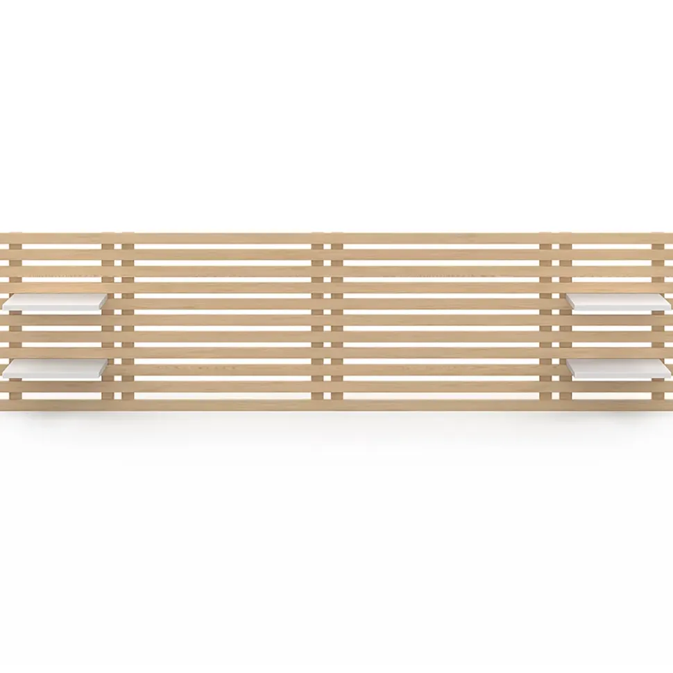 Craquez pour le look moderne de la tête de lit AVA au design bicolore effet bois clair et blanc. Cette tête de lit de 240 cm de long habillera votre mur et apportera une touche cossue et design à votre lit.Adaptable à tous les lits 140 cm et 160 cm, la tête de lit AVA est facile à installer. Grâce à son design fin et ses accroches murales, elle permet également un gain de place dans votre chambre à coucher.La tête de lit AVA est également composée de 4 tablettes de chevet blanches modulables que vous pouvez placer à la hauteur qui vous convient le mieux. Vous pourrez ainsi y déposer vos affaires personnelles, nécessaire de nuit, réveil ou encore lampes de chevet.Sa hauteur de 62 cm vous permet de vous adosser confortablement avec vos oreillers pour lire ou regarder votre série préférée. Pour un effet encore plus cocooning dans votre chambre, choisissez d’entrelacer une guirlande lumineuse sur le haut de votre tête de lit et profitez ainsi d’une ambiance chaleureuse toute la soirée. Dimensions de la tête de lit lattes AVA en bois clair et étagères blanchesDimensions globales : Longueur 240 cm x largeur 23,5 cm x Hauteur 62 cmDimensions d’une étagère : L.32,5 x l.20,5 x H.1,8 cmMatériaux : Panneaux de particules revêtement mélaminéColoris : Bois clair et étagères blanchesEspace entre chaque latte : 2 cmLongueur centrale entre les étagères : 160 cmKit de fixation inclusÀ monter soi-mêmeRetrouvez également nos autres têtes de lit disponibles sur notre boutique en ligne.
