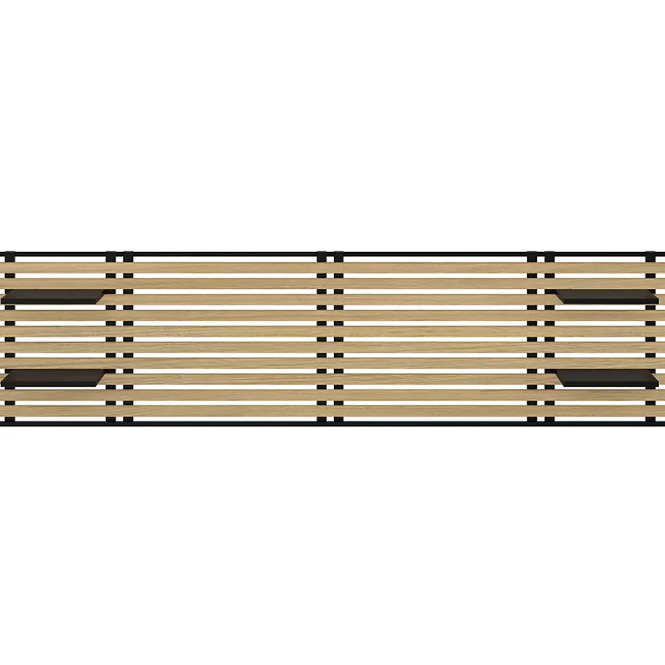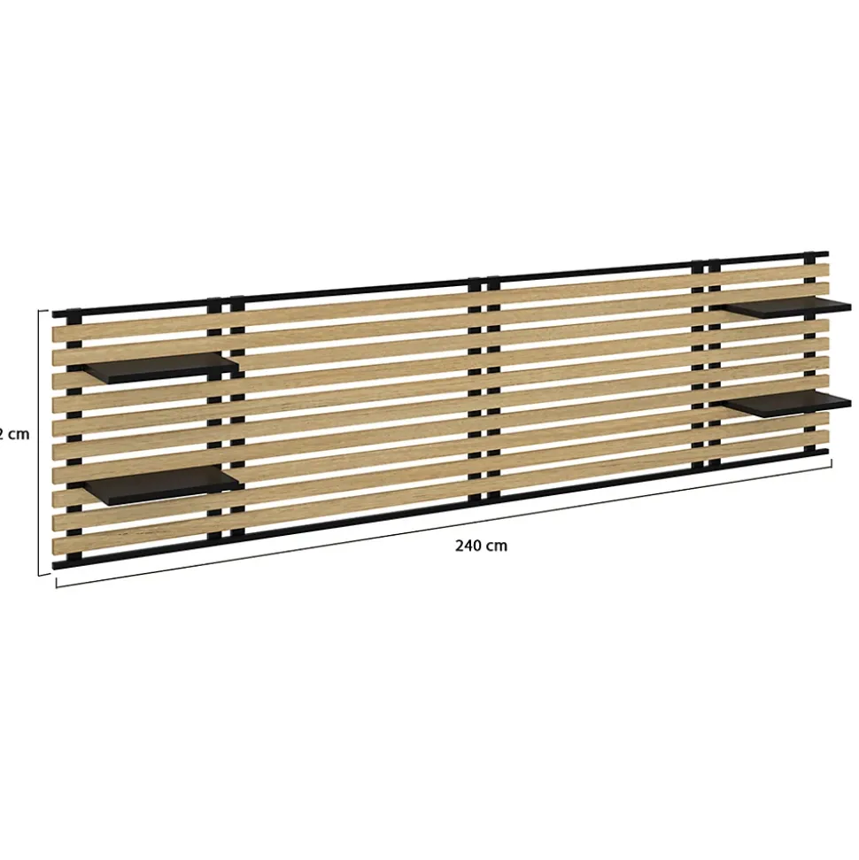 Apportez une touche industrielle et design dans votre chambre à coucher grâce à la tête de lit DETROIT, avec son cadre en métal noir et ses lattes effet bois.D’une hauteur de 62 cm, vous pourrez vous adosser confortablement avec vos oreillers pour regarder un film ou lire votre livre préféré. Pratique, elle s’adapte à tous les lits de 140 et 160 cm et ne prend pas de place grâce à ses accroches murales et son design fin.Composée de 4 tablettes de chevet noires modulables, vous pourrez les placer à la hauteur qui vous convient. Déposez vos affaires personnelles, nécessaires de nuit, réveil ou encore lampe de chevet, tout en les ayant à portée de main.Cette tête de lit habillera votre mur à la perfection et apportera une touche industrielle et design à votre chambre à coucher.Pour un effet encore plus cocooning dans votre chambre, choisissez d’entrelacer une guirlande lumineuse sur le haut de votre tête de lit et profitez ainsi d’une ambiance chaleureuse toute la soirée. Dimensions de la tête de lit lattes DETROIT 240 cmDimensions totales : Longueur 240 cm x largeur 23,5 cm x Hauteur 62 cmDimensions d’une étagère : L.32,5 x l.20,5 x H.1,8 cmMatériaux : Métal + PB + MDF Coloris : Bois et noirEspace entre chaque latte : 2 cmLongueur centrale entre les étagères : 160 cmKit de fixation inclusÀ monter soi-mêmeRetrouvez l’ensemble de nos têtes de lit sur notre boutique en ligne !