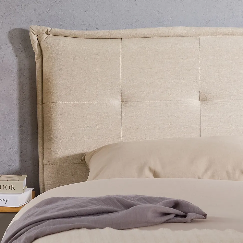 Tête de lit Timothé capitonnée Transformez votre chambre avec cette tête de lit moderne et pratique. Avec son rembourrage et son design décoratif capitonné, elle met l’accent à la fois sur le confort et l’élégance pour une ambiance chaleureuse. Conçue pour les lits jusqu’à 140 cm de largeur, elle se distingue par son tissu résistant au boulochage et ses pieds en bois naturel qui assurent une installation stable et sans effort. Description des matériaux : – Le revêtement de la tête de lit est en tissu 100% polyester, coloris écru. – Les pieds sont en bois d’hévéa. Caractéristiques du produit : – Hauteur des pieds : 42 cm – Tête de lit capitonnée pour un design travaillé et moderne – Convient pour les lits jusqu’à 140 cm – Conseils d’installation : posez la tête de lit directement sur le sol et coincez-la entre le mur et votre lit pour assurer sa stabilité Livraison et montage : – Contenu de la livraison : 1 tête de lit – Article livré en une seule pièce – Assemblage facile grâce à la notice fournie – Livraison par transporteur – Article livré sans décoration – Photo non contractuelle Résumé: – Hauteur tête de lit: 99 cm – Convient uniquement avec: Sommier fagot à lattes – Description du matériel: 100% Polyester – Dimensions monté: 99 x 142 x 7 cm (H x L x L) – Couchage: 140 x 190 cm, 140 x 200 cm, 140 x 220 cm – Couleur: Beige – Matériel: Tissu de recouvrement, Bois