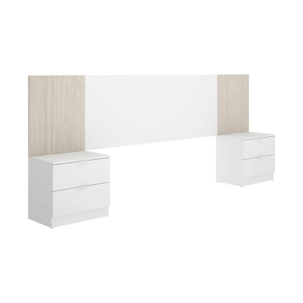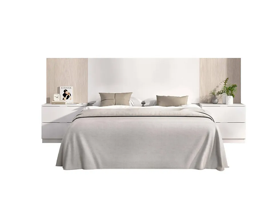 TÊTE DU LIT – Tête de lit, Tête de lit pour la chambre, Appui-tête, 259×34 h106 cm, Blanc et Chêne clair. STRUCTURE ET UTILISATION – La structure aux lignes modernes de cet ensemble est parfaite pour décorer tout type de chambre d’enfant ou d’adulte – À l’intérieur des deux tiroirs de la table de chevet, il est possible de placer vos objets et les choses nécessaires pour la nuit de manière discrète et bien rangé, tandis que sur la surface supérieure, vous pouvez placer vos livres et décorations préférés pour donner au produit un style personnalisé – Ensemble avec tête de lit adapté à tout type de chambre. QUALITÉ ET DESIGN – Meuble au design moderne et élégant, parfait pour meubler un environnement contemporain et lumineux – Idéal pour ceux qui recherchent des solutions fonctionnelles et peu encombrantes, ce produit est parfait pour les maisons et les appartements de toutes tailles – Garantie de deux ans à compter de la date d’achat. CARACTÉRISTIQUES TECHNIQUES – Accessoire d’ameublement polyvalent, conçu pour une intégration facile avec d’autres meubles – Emballage résistant, conçu pour le commerce électronique – Matériau: Panneau mélaminé 16mm – Informations supplémentaires: Fabriqué entièrement en panneaux de particules mélaminés, un matériau résistant aux chocs et aux rayures, durable et imperméable – Chants avec finition mélamine – Classement selon la teneur ou le rejet de formaldéhyde de TYPE E1 – Le montage est simple et rapide : grâce aux outils de montage fournis dans un kit avec le produit et le livret d’instructions vous pouvez assembler votre produit en quelques minutes – Deux tables de chevet avec quatre tiroirs inclus – Convient pour lit 190×135-140 cm – Poids maximum supporté par tiroir : 4 Kg – Chêne effet ondulé. DIMENSIONS EN CM – Tête du lit : Longueur: 258,6 Largeur: 34,2 Hauteur: 106