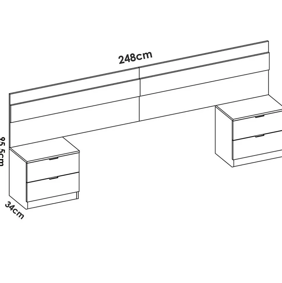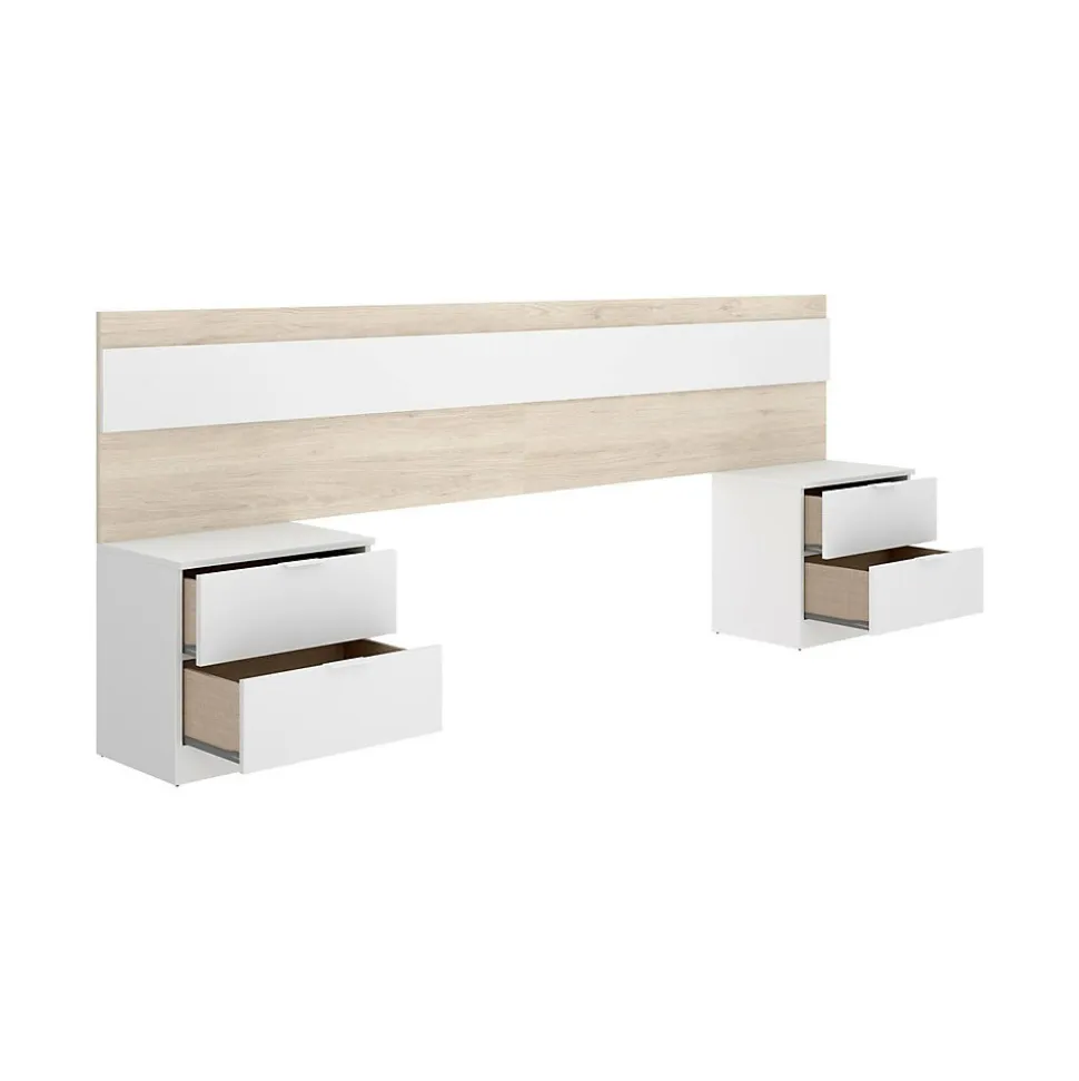 TÊTE DU LIT – Tête de lit, Tête de lit pour la chambre, Appui-tête, 248×34 h96 cm, Chêne clair et Blanc. STRUCTURE ET UTILISATION – La structure aux lignes modernes de cet ensemble est parfaite pour décorer tout type de chambre d’enfant ou d’adulte – À l’intérieur des deux tiroirs de la table de chevet, il est possible de placer vos objets et les choses nécessaires pour la nuit de manière discrète et bien rangé, tandis que sur la surface supérieure, vous pouvez placer vos livres et décorations préférés pour donner au produit un style personnalisé – Ensemble avec tête de lit adapté à tout type de chambre. QUALITÉ ET DESIGN – Meuble au design moderne et élégant, parfait pour meubler un environnement contemporain et lumineux – Idéal pour ceux qui recherchent des solutions fonctionnelles et peu encombrantes, ce produit est parfait pour les maisons et les appartements de toutes tailles – Garantie de deux ans à compter de la date d’achat. CARACTÉRISTIQUES TECHNIQUES – Accessoire d’ameublement polyvalent, conçu pour une intégration facile avec d’autres meubles – Emballage résistant, conçu pour le commerce électronique – Matériau: Panneau mélaminé 16mm – Informations supplémentaires: Fabriqué entièrement en panneaux de particules mélaminés, un matériau résistant aux chocs et aux rayures, durable et imperméable – Chants avec finition mélamine – Classement selon la teneur ou le rejet de formaldéhyde de TYPE E1 – Le montage est simple et rapide : grâce aux outils de montage fournis dans un kit avec le produit et le livret d’instructions vous pouvez assembler votre produit en quelques minutes – Deux tables de chevet avec quatre tiroirs inclus – Convient pour lit 190×135-140 cm – Poids maximum supporté par tiroir : 4 Kg – Chêne effet ondulé. DIMENSIONS EN CM – Tête du lit : Longueur: 248 Largeur: 34,2 Hauteur: 96