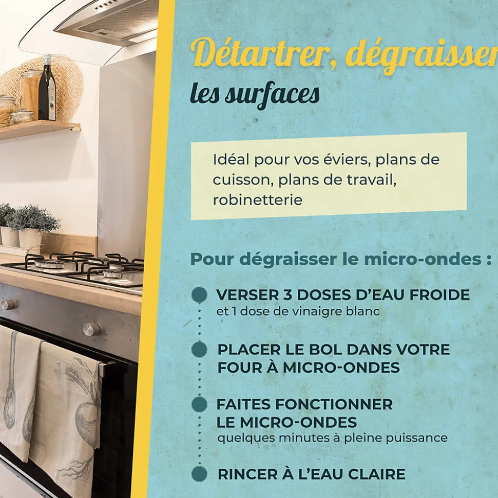 Il est connu et utilisé depuis longtemps par nos grands-mères pour ses multiples applications dans l’entretien des intérieurs comme des extérieurs. On l’utilise sur :Les robinetteries, Parois de douche, Sanitaires, Carrelage, Plan de travail, Electroménager, Poubelle