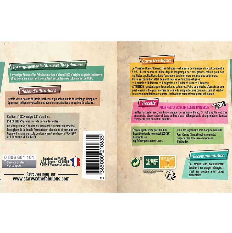 Le vinaigre blanc en gel 9,5° Starwax The Fabulous est issu d’alcool 100% d’origine végétale. Il est obtenu par la fermentation alcoolique et acétique d’alcools de betterave et/ou de canne à sucre. Il ne contient ni colorant ni OGM. Ce vinaigre blanc en gel 9,5° est un produit multi-usages, il sert à : détartrer, dégraisser, adoucir l’eau ,détacher