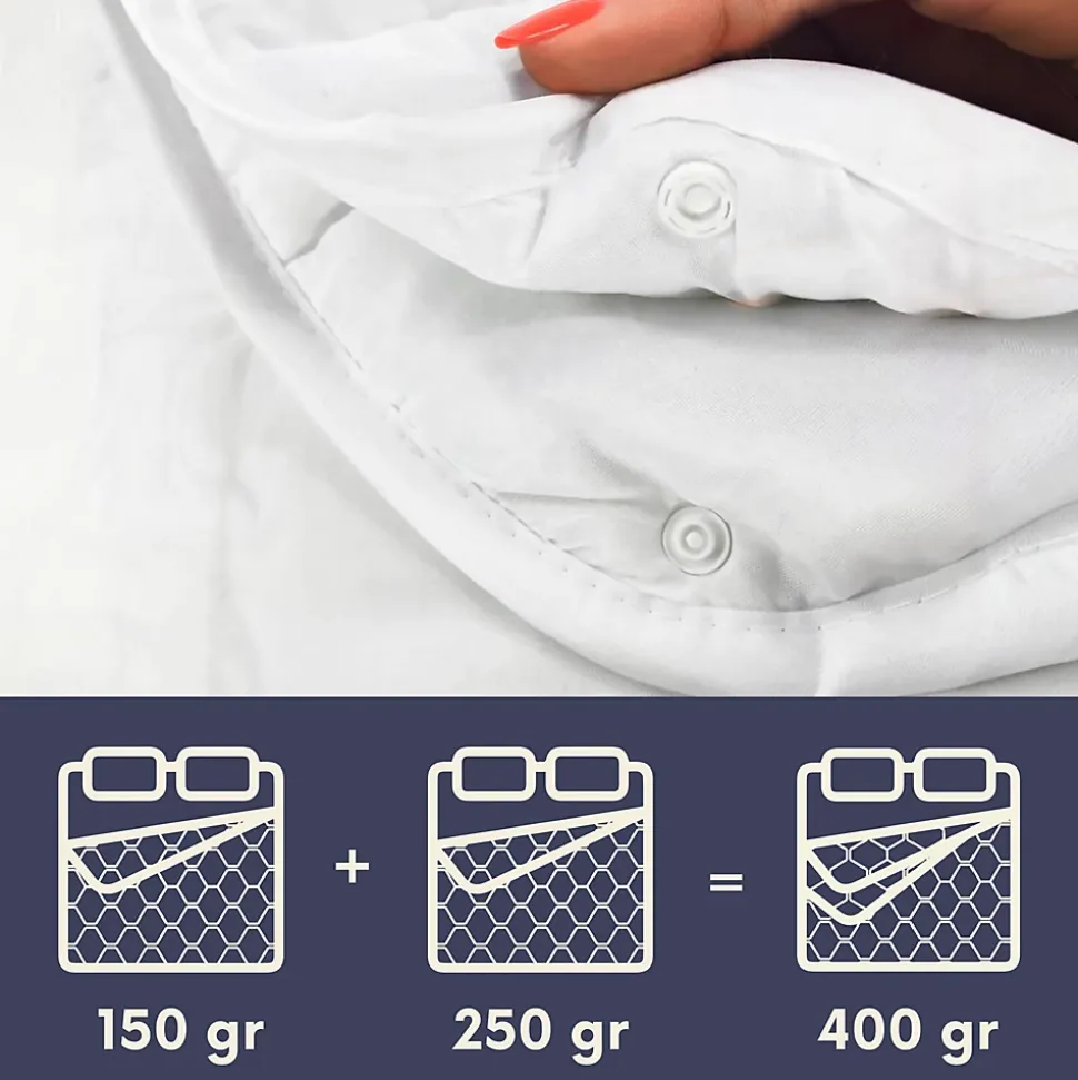 COUETTE D’HIVER. La couette The White Stone de 400 g/m² avec garnissage 100 % en fibre creuse siliconée hypoallergénique est idéale pour les froides nuits d’hiver. Le garnissage important en ouate de haute qualité garantit un repos chaud et doux, et le piquage est spécialement étudié pour permettre à la ouate de rester bien en place, assurant une chaleur uniforme et agréable, sans accumulations gênantes dans les coins ou sur les côtés.MATÉRIAUX DE QUALITÉ. La couette simple The White Stone est entièrement fabriquée avec des matériaux certifiés et de haute qualité, adaptés à toute la famille. La ouate Soft possède des propriétés respirantes et empêche l’accumulation d’humidité, maintenant la peau sèche même en été. Le tissu en microfibre douce se caractérise par des propriétés hypoallergéniques et anti-acariens, garantissant un repos sain et sûr pour les personnes âgées, les adultes et les enfants.LONGUE DURÉE GARANTIE. La couette d’hiver simple est composée de matériaux de grande qualité, soigneusement sélectionnés pour vous garantir un achat sûr et durable. Il vous suffira de suivre quelques précautions lorsque nécessaire : laver la couette à une température maximale de 40 degrés, ne pas utiliser de détergents agressifs, ne pas conserver le produit dans des endroits fermés ou peu aérés pendant de longues périodes et, dans tous les cas, aérer la couette de temps en temps.UNE COUETTE POUR CHAQUE BESOIN. The White Stone propose non seulement des couettes de différents grammages, mais offre également la possibilité de choisir entre différentes dimensions afin de s’adapter à chaque lit, qu’il soit simple ou double. Pour un lit simple, nous proposons la couette 135×200 cm, 140×200 cm ou 155×200 cm ; pour un lit une place et demie, nous proposons la couette 180×200 cm, 200×200 cm ou 200×220 cm ; enfin, pour un lit double, vous pourrez choisir entre la couette 210×240 cm et 210×260 cm.
