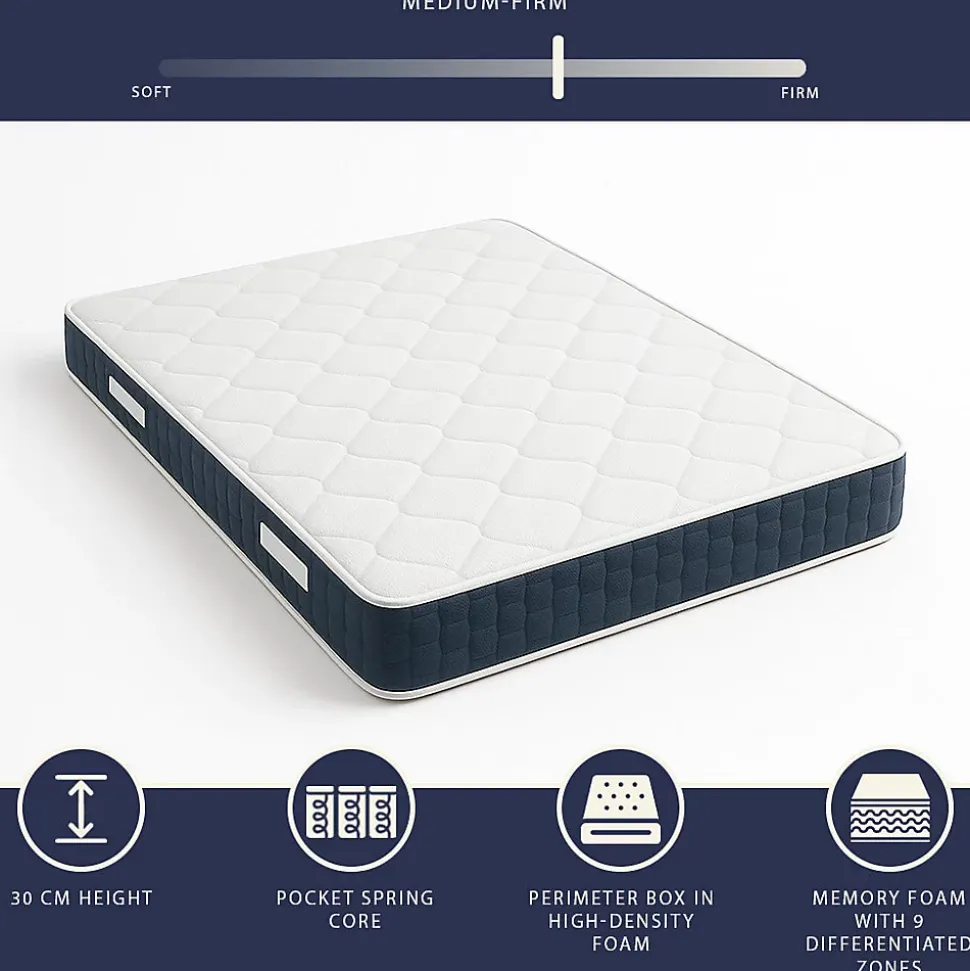 CONFORT ET SOUTIEN PERSONNALISÉ. Hauteur 30 cm, ce matelas combine des ressorts ensachés indépendants et de la mousse à mémoire à 9 zones différenciées, offrant un sommeil confortable et un soutien calibré pour tout le corps. Le mélange de technologies garantit un bon alignement de la colonne vertébrale et réduit les points de pression. Sa fermeté moyenne le rend idéal pour ceux qui recherchent un équilibre entre accueil et maintien.RESPIRANT ET HYPOALLERGÉNIQUE. Grâce à sa structure interne très ventilée et sa housse respirante, le matelas empêche efficacement la formation de moisissures, de bactéries et d’humidité stagnante. Les matériaux hypoallergéniques réduisent le risque de réactions cutanées ou respiratoires, le rendant adapté aux personnes sensibles. La structure non déhoussable est complétée par des rembourrages internes conçus pour maintenir une température constante et agréable toute la nuit.PRODUIT ENTIEREMENT EN ITALIE. Chaque étape de la production du matelas à ressorts et mousse mémoire se déroule en Italie, dans une filière contrôlée où chaque phase – du choix des matériaux à la réalisation des rembourrages – est effectuée avec soin et précision. Les poignées latérales solides facilitent le transport et la rotation du matelas, tandis que les tissus utilisés sont durables et conçus pour résister dans le temps.QUALITÉ CERTIFIÉE ET MATÉRIAUX SÉCURISÉS. Le matelas offre des bénéfices concrets pour la santé de la colonne vertébrale et la relaxation musculaire. Il est fabriqué avec des matériaux sûrs et dispose du marquage CE, garantissant l’absence de substances nocives et la sécurité des composants. Le rembourrage haute densité et les tissus latéraux respirants assurent durabilité et stabilité.INSTALLATION. Nos matelas sont livrés roulés et sous vide pour faciliter le transport; après ouverture, laissez le matelas reprendre sa forme pendant quelques heures avant utilisation.