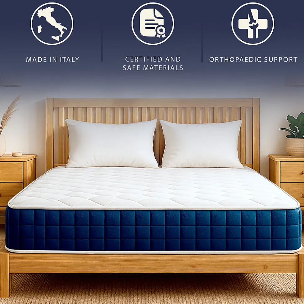 - MATELAS MEMORY FOAM ET RESSORTS ENSACHÉS – 30 CM – Ce matelas combine des ressorts ensachés indépendants et du Memory Foam à 9 zones pour un soutien ergonomique et un confort personnalisé. Réduit les points de pression et maintient la colonne vertébrale alignée, idéal pour un sommeil régénérant.La structure respirante et les matériaux hypoallergéniques garantissent fraîcheur et hygiène, en empêchant la formation de moisissures, bactéries et acariens. Entièrement fabriqué en Italie, avec des poignées latérales pour un transport et une rotation faciles.Assure un soutien sûr et une qualité certifiée. Expédié roulé et sous vide, non déhoussable mais facile à nettoyer avec un chiffon humide.