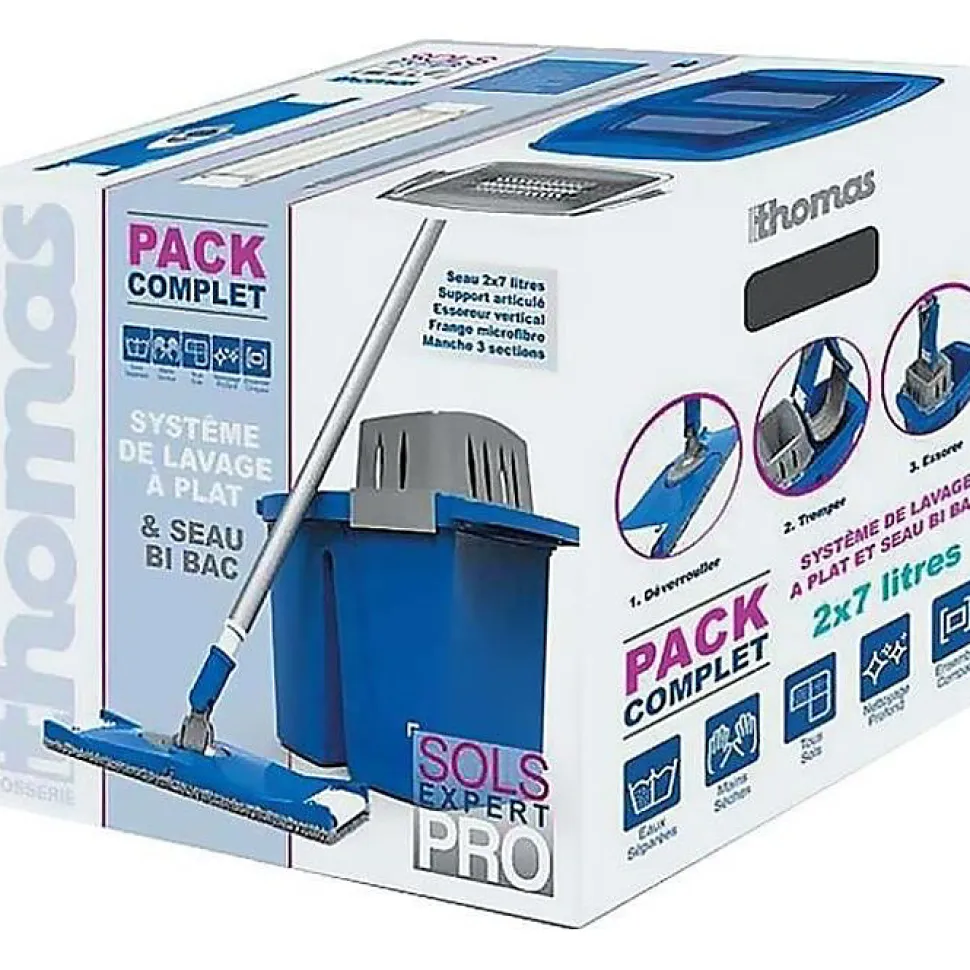 kit de lavage sols, seau double bac 2×7 litres gradué – Essoreur vertical lave a plat – Frange microfibre, manche en 3 sections.