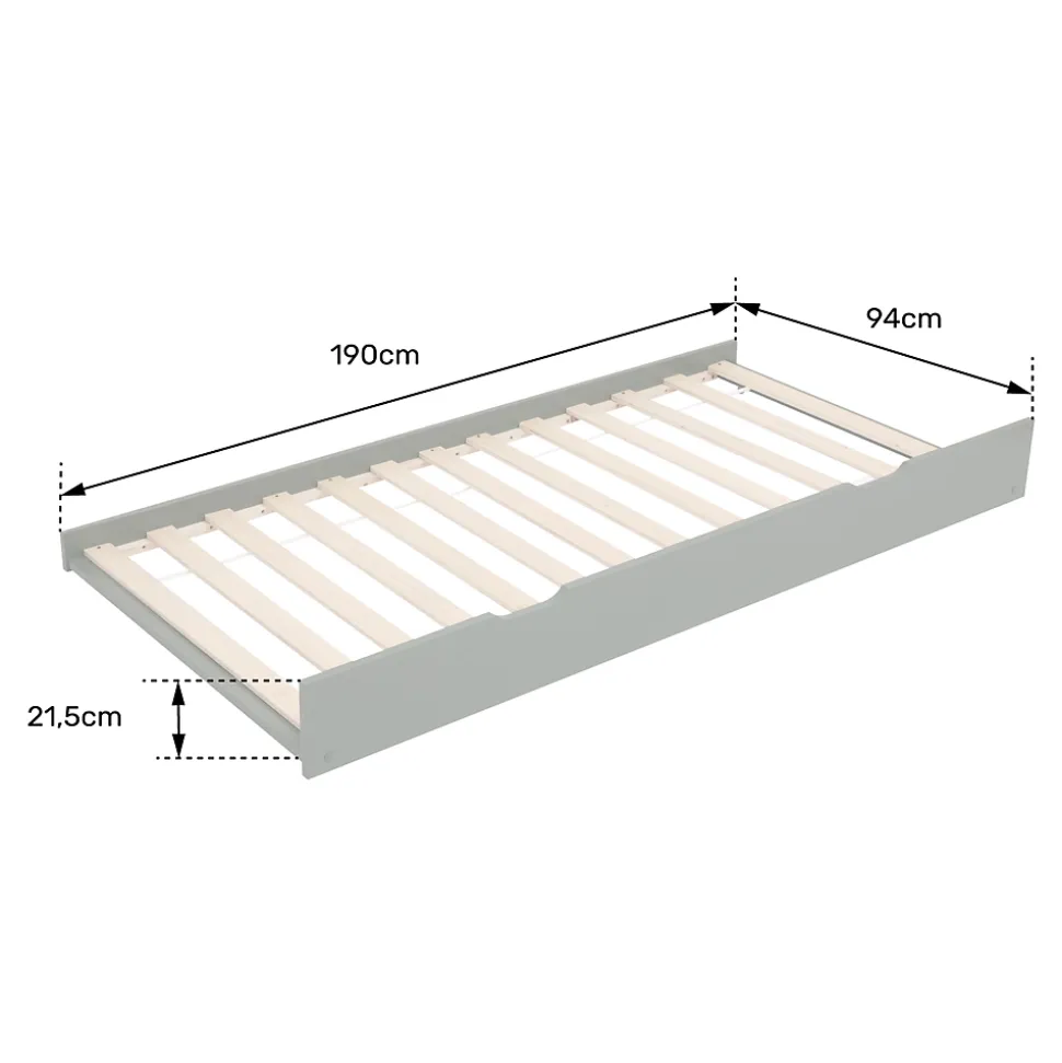 Gain de place optimal : Parfait pour les petits espaces, il se glisse sous un lit pour offrir un couchage supplémentaire sans encombrer la pièce, Pratique et facile à utiliser : Grâce à ses roulettes intégrées, le tiroir-lit se sort et se range en un clin d’œil, sans effort, Robustesse et confort : Avec sa structure en bois de pin et sa taille 190x90cm, il accueille les cousins ou les copains pour des pyjamas party fun !