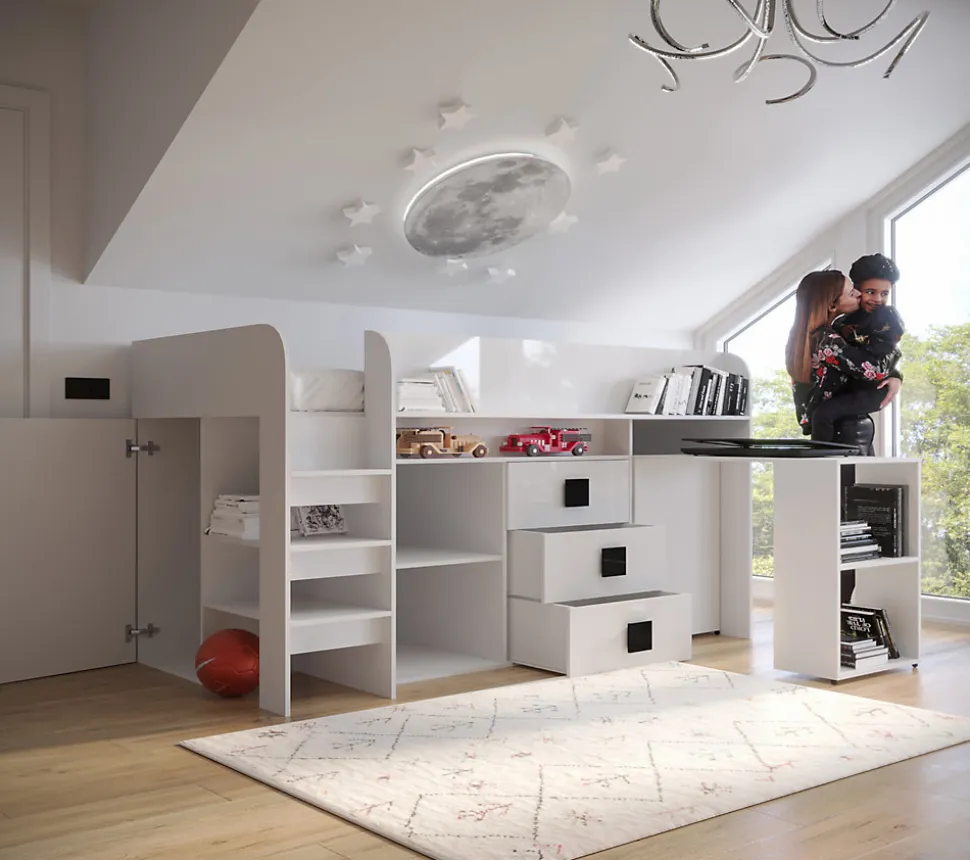 Meuble Multifonctionnel:Nous vous proposons une solution révolutionnaire – le lit superposé avec bureau, escalier, armoire, étagère et tiroirs. Ce meuble moderne vous permettez d’avoir tous les objets nécessaires à portée de la main. Vous pouvez choisir la côté de lit pendant le montage. Lit Superposé pour Chambre Ado:Le lit superposé est un meuble nécessaire dans une chambre d’enfant ou d’adolescent. Cette option est très confortable, parce que vous pouvez optimiser l’espace de la chambre et gagner de la place, ce qui est excellent pour les petits espaces. Spécifications Techniques:Dimensions : 203.3 x 106.6 x 125 cm.Espace de couchage : 90 x 200 cm.Armoire avec barre : largeur – 46.7 / profondeur – 35cm,armoire avec étagère : largeur – 47.5 / profondeur – 38cm,tiroirs : largeur – 56,9 / profondeur – 35cm. Construction Solide:Le lit superposé est fabriqué en plateau stratifiée d’épaisseur 16 mm, chants finis avec un placage en PVC durable et résistant à l’usage quotidien, dos du meuble en panneau HDF, les tiroirs se déplacent sur des glissières à rouleaux, poignées en MDF. Livraison et Montage:Attention ! Notre entreprise de transport n’offert pas la possibilité de monter par l’escalier sur l’appartement et n’offert pas le service de montage. Les meubles sont livrés dans les paquets avec l’instruction de montage soi-même. La livraison est sur la palette. Information téléphonique sur la date de livraison. Veuillez demander un numéro de contact actualisé.