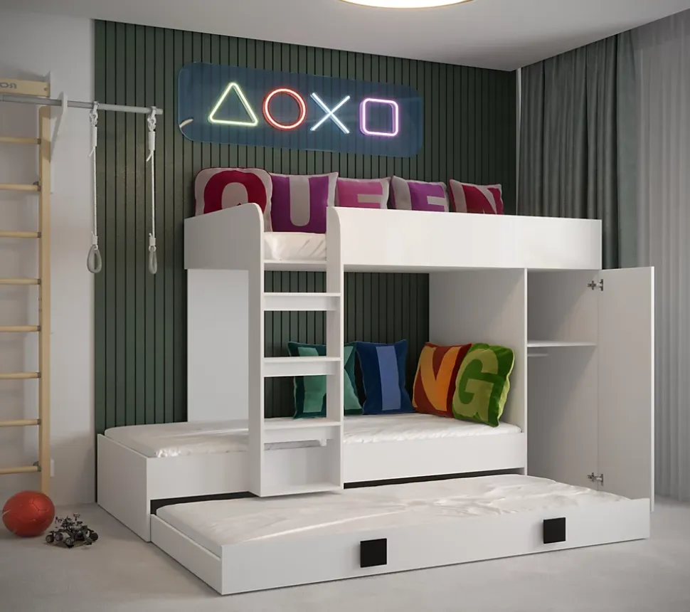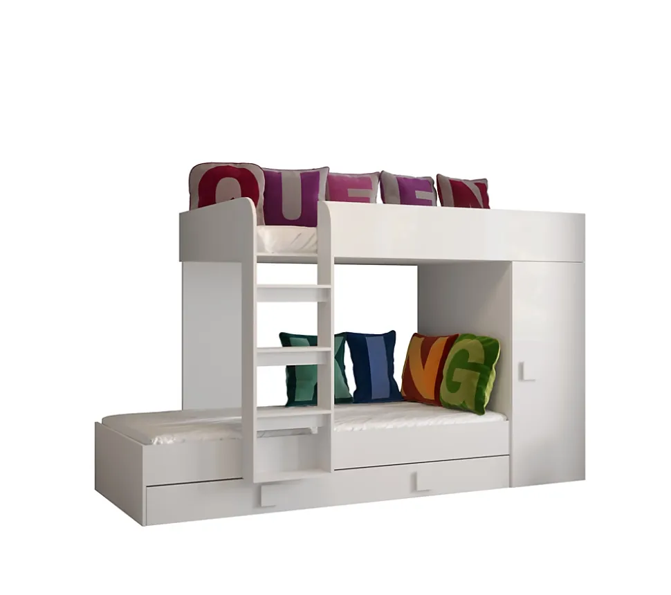 Meuble Multifonctionnel:Nous vous proposons une solution révolutionnaire – le lit superposé avec 3 surfaces de couchage, escalier et l’armoire, dans se trouve une étagère et un tringle. Ce meuble moderne vous permettez d’avoir tous les objets nécessaires à portée de la main. Vous pouvez choisir la côté de lit pendant le montage. Lit Superposé pour Chambre Ado:Le lit superposé est un meuble nécessaire dans une chambre d’enfant ou d’adolescent. Cette option est très confortable, parce que vous pouvez optimiser l’espace de la chambre et gagner de la place, ce qui est excellent pour les petits espaces. Spécifications Techniques:Dimensions : 254 x 165 x 94 cm (largeur x hauteur x profondeur).Trois surfaces de couchage : 90 x 200 cm et 2 x 85 x 200 cm. Construction Solide:Le lit superposé est fabriqué en plateau stratifiée d’épaisseur 16 mm, chants finis avec un placage en PVC durable et résistant à l’usage quotidien, dos du meuble en panneau HDF, les tiroirs se déplacent sur des glissières à rouleaux, poignées en MDF. Livraison et Montage:Attention ! Notre entreprise de transport n’offert pas la possibilité de monter par l’escalier sur l’appartement et n’offert pas le service de montage. Les meubles sont livrés dans les paquets avec l’instruction de montage soi-même. La livraison est sur la palette. Information téléphonique sur la date de livraison. Veuillez demander un numéro de contact actualisé.