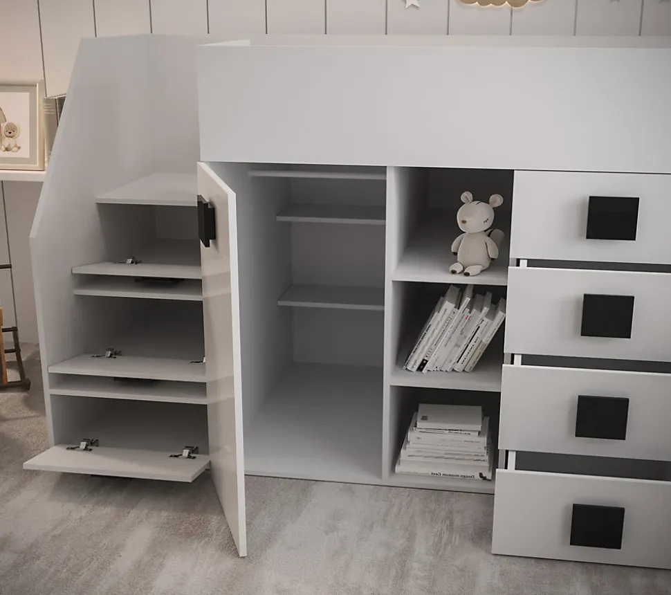 Meuble Multifonctionnel:Nous vous proposons une solution révolutionnaire – le lit superposé avec bureau coulissant, marchepieds, armoire avec barre coulissante, 4 tiroirs, 6 étagères ouvertes et 3 armoires avec étagères. Ce meuble moderne vous permettez d’avoir tous les objets nécessaires à portée de la main. Le montage de lit à gauche. Lit Superposé pour Chambre Ado:Le lit superposé est un meuble nécessaire dans une chambre d’enfant ou d’adolescent. Cette option est très confortable, parce que vous pouvez optimiser l’espace de la chambre et gagner de la place, ce qui est excellent pour les petits espaces. Spécifications Techniques:Dimensions : 248,5 x 123 x 93 cm (largeur x hauteur x profondeur).Surface de couchage : 90 x 200 cm.Bureau 88 x 76 x 45,5 cm (largeur x hauteur x profondeur ) et espace pour les jambes 50 cm Construction Solide:Le lit superposé est fabriqué en plateau stratifiée d’épaisseur 16 mm, chants finis avec un placage en PVC durable et résistant à l’usage quotidien, dos du meuble en panneau HDF, les tiroirs se déplacent sur des glissières à rouleaux, poignées en MDF. Livraison et Montage:Attention ! Notre entreprise de transport n’offert pas la possibilité de monter par l’escalier sur l’appartement et n’offert pas le service de montage. Les meubles sont livrés dans les paquets avec l’instruction de montage soi-même. La livraison est sur la palette. Information téléphonique sur la date de livraison. Veuillez demander un numéro de contact actualisé.