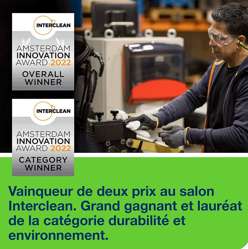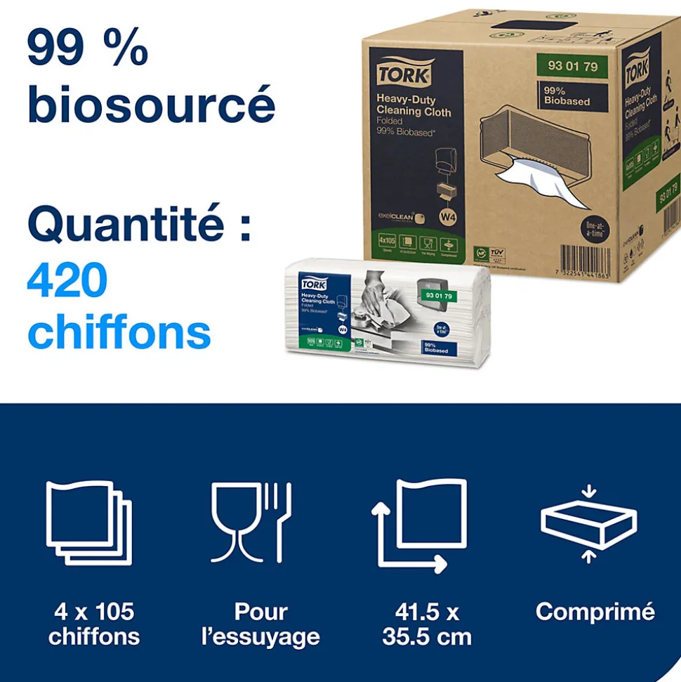 Tork Chiffon de nettoyage ultra-résistant biosourcé blanc W4 :Réduisez votre empreinte grâce à des chiffons de nettoyage durables certifiés OK Biobased par TÜV Austria. Ce label garantit l’utilisation de matières premières renouvelables pour un impact environnemental réduit. L’emballage extérieur est composé à 100 % de fibres recyclées, tandis que l’emballage intérieur comprend 30 % de plastique recyclé post-consommation. Ces chiffons offrent le même niveau de performance que les chiffons de nettoyage ultra-résistants conventionnels. Leur technologie exelCLEAN rend le nettoyage jusqu’à 30 % plus rapide et 20 % plus facile, et réduit la consommation de solvant jusqu’à 40 % par rapport aux chiffons mixtes (recherche Swerea, 2014).