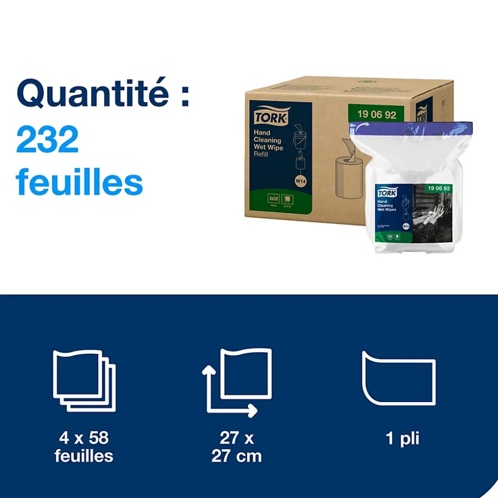 Tork Lingettes humides pour Nettoyage des mains blanches W14 :En l’absence d’eau à proximité, comptez sur nos Lingettes humides pour Nettoyage des mains Tork. Leur structure résistante vous permet d’éliminer rapidement huile, graisse et lubrifiants. Grâce à leur qualité professionnelle, vous pouvez nettoyer la saleté efficacement. Nos lingettes premium 1 pli sans parfum présentent une formule douce pour les mains. Le rechargement est également simplifié : les lingettes utilisées avec notre seau vous facilitent la tâche.