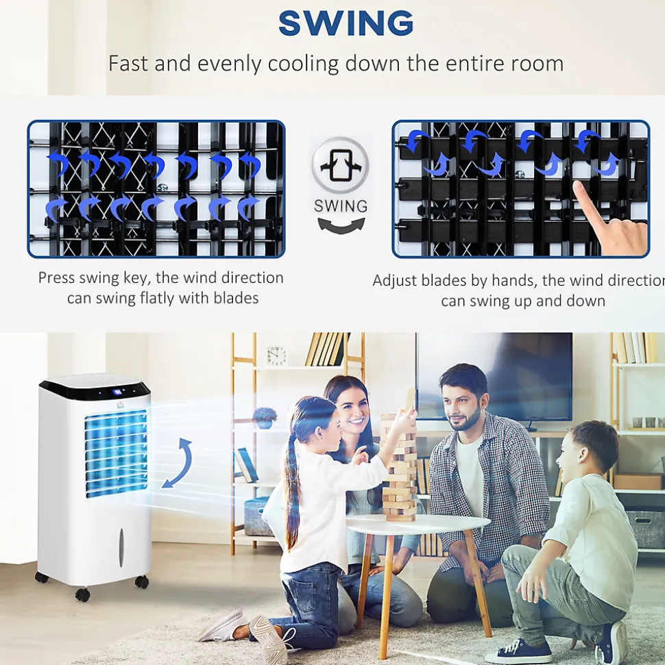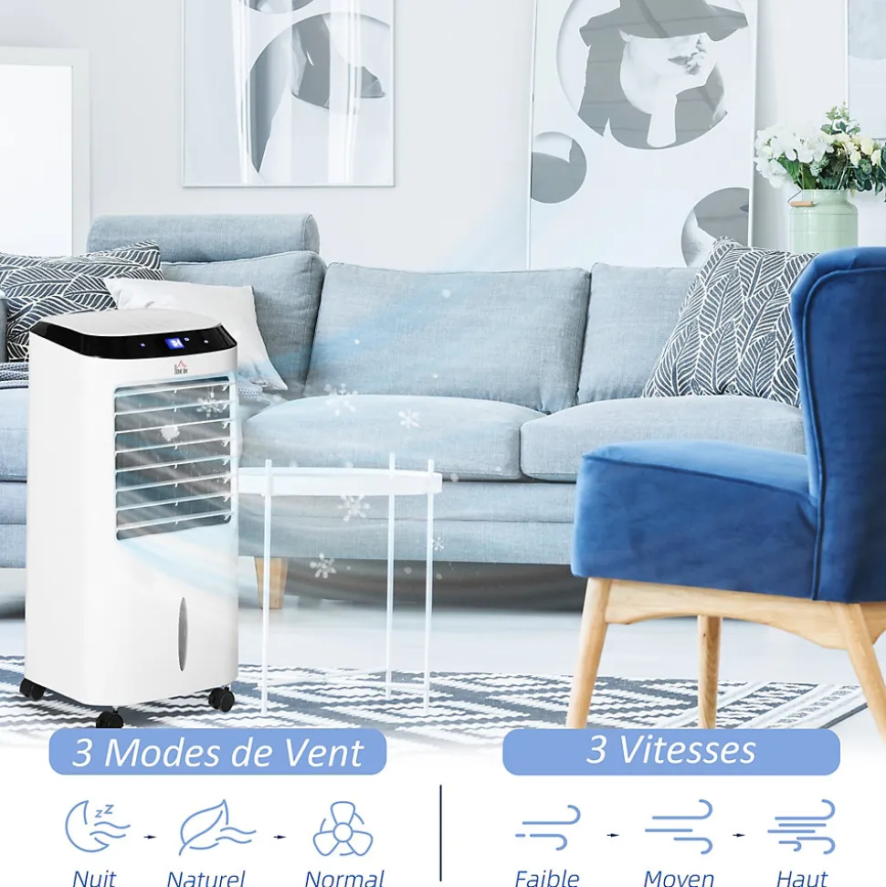 Ce Ventilateur rafraichisseur d’air humidificateur ioniseur 4 en 1 avec télécommande est le meilleur investissement à faire pour se ventiler, augmenter le niveau d’humidité, rafraichir et purifier l’air de votre pièce. Discret, peu encombrant, d’une grande mobilité grâce à ses roulettes pivotantes, il sera très pratique et simple à utiliserCaractéristiques :- Ventilateur rafraichisseur d’air humidificateur ioniseur 4 en 1 avec télécommande (pile CR2025 non incluse)- 2 blocs réfrigérants fournis vous permettant de gagner en fraicheur en mode ventilateur- Equipement idéal pour utilisation dans une pièce de env. 20 m² max.- Panneau de contrôle supérieur très intuitif avec affichage LED- Nombreuses fonctions : timer 8H (avec étape par heure pour programmer le cycle de refroidissement), 3 modes (normal, naturel, nuit), 3 vitesses (haute, moyenne, faible)- Oscillement automatique possible avec réglage directionnel (vertical et horizontal) de la buse d’air- Appareil silencieux ne perturbant pas le sommeil la nuit- 4 roulettes pivotantes à 360° vous facilitant son déplacement- Capot arrière amovible pour accéder et nettoyer facilement le filtre- Certifié normes CE-EMC, LVD, RoHS, ERP + norme d’étanchéité IPX8Spécifications :- Couleurs : blanc et noir- Matériau : ABS- Dim. totales : 38,2L x 31,6l x 76H cm- Volume du réservoir d’eau : 10 L- Tension nominale : 220-240 V / 50 Hz- Puissance nominale : 60 W- Capacité de couverture : env. 20 m² max.- Longueur câble d’alimentation : 1,5 m- Accessoires fournis : 2 blocs réfrigérants- Livraison effectuée en un colis- Réf. : 824-037V90