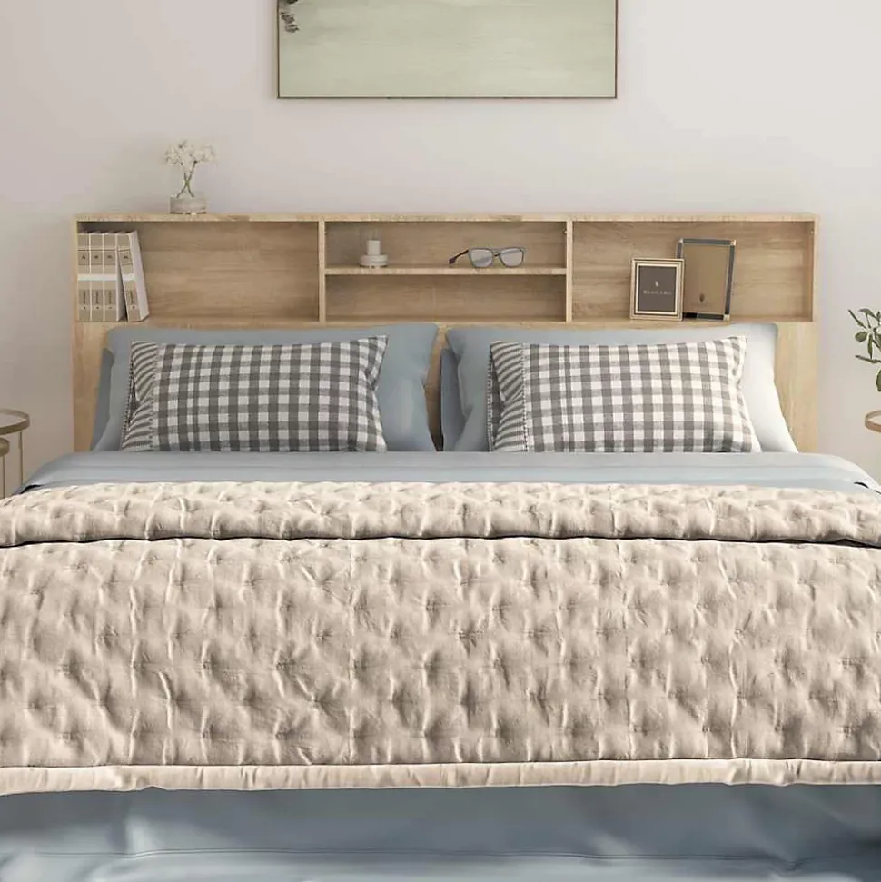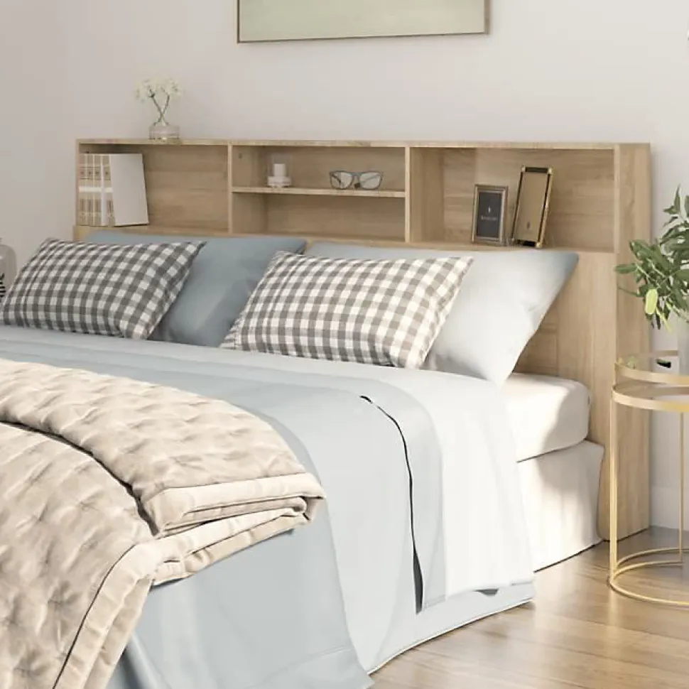 Armoire de tête de lit en chêne sonoma combinant design contemporain et fonctionnalité optimale. Bois d’ingénierie durable et résistant avec 4 compartiments intégrés. Installation sécurisée avec kit de fixation murale inclus. Dimensions 200 x 19 x 103,5 cm. L’assemblage est requis.
