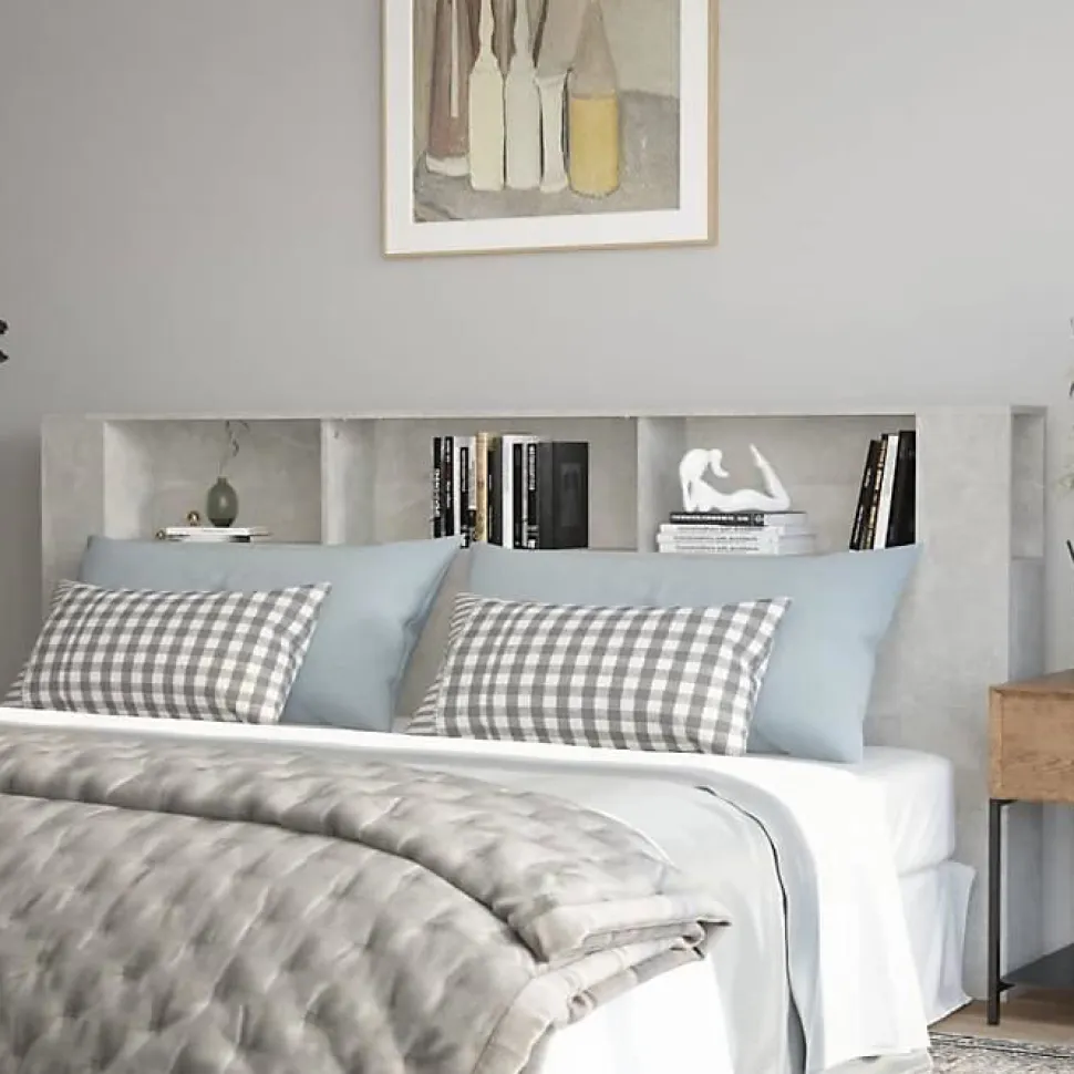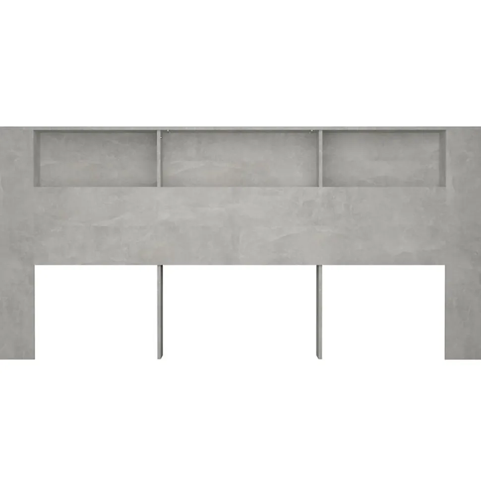 Armoire tête de lit gris béton avec 3 compartiments de rangement, en bois d’ingénierie résistant à l’humidité, fixation murale incluse pour sécurité, dimensions 220 x 18,5 x 104,5 cm, design moderne et fonctionnel.