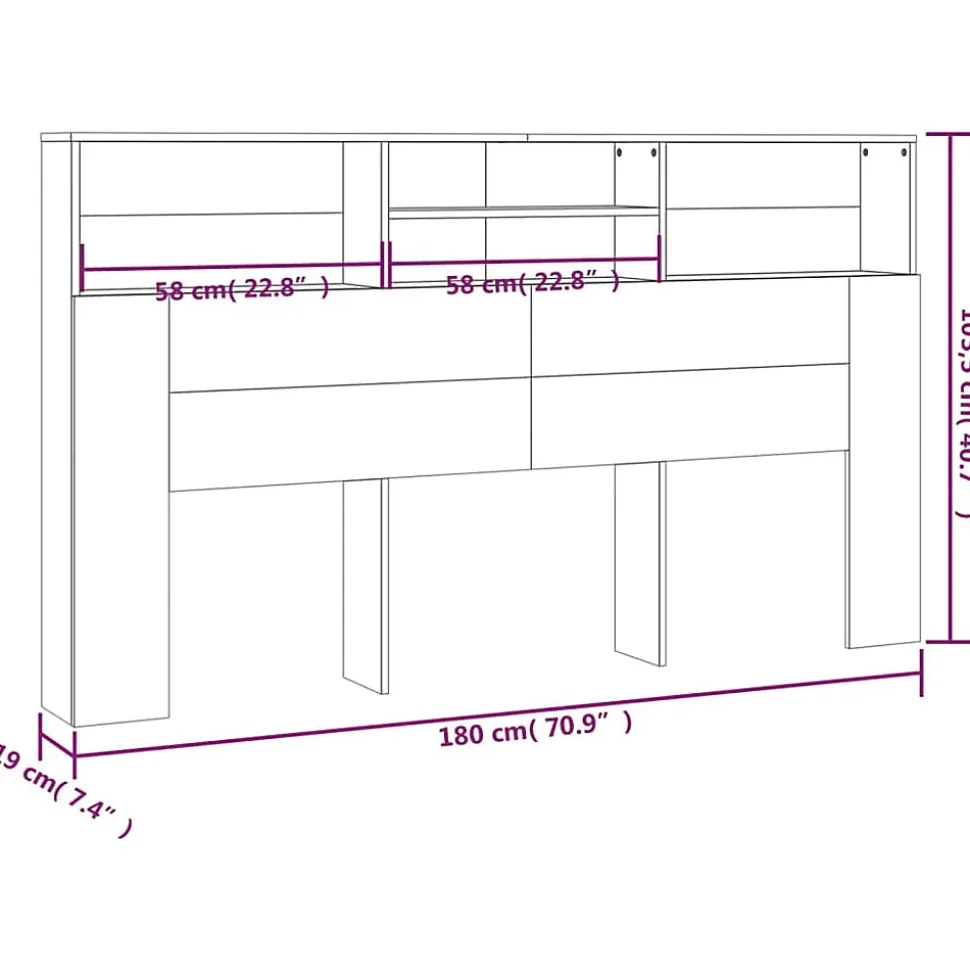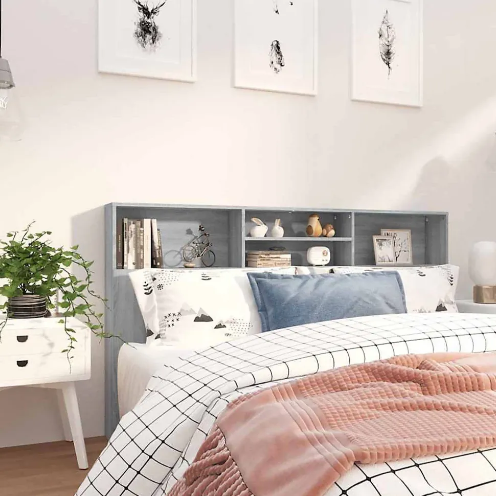 Armoire de tête de lit Sonoma gris en bois d’ingénierie, dimensions 180 x 19 x 103,5 cm. Avec quatre compartiments pour rangement, design contemporain et montage facile. Fournie avec fixation murale pour plus de sécurité.