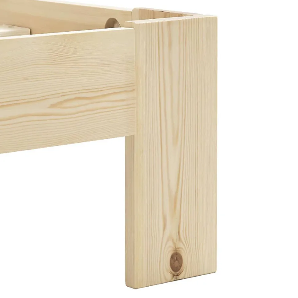 Cadre de lit robuste et stable en bois de pin massif avec lattes en contreplaqué pour un soutien optimal. Pieds massifs pour une stabilité et une sécurité accrues. Finition naturelle et design épuré, dimensions adaptées pour matelas 160×200 cm.