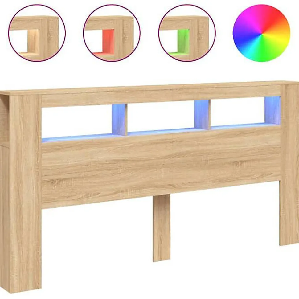 Tête de lit chêne sonoma avec LED RVB réglable, fabriquée en bois d’ingénierie durable. Dimensions 200 x 18,5 x 103,5 cm. Rangement intégré, connecteur USB 5V (alimentation non incluse). Offre un soutien dorsal confortable. Assemblage requis.