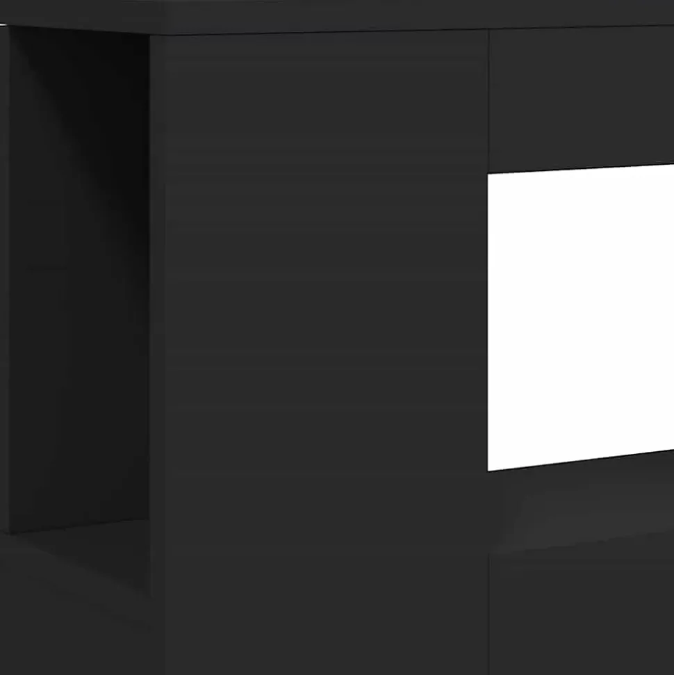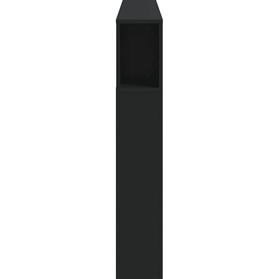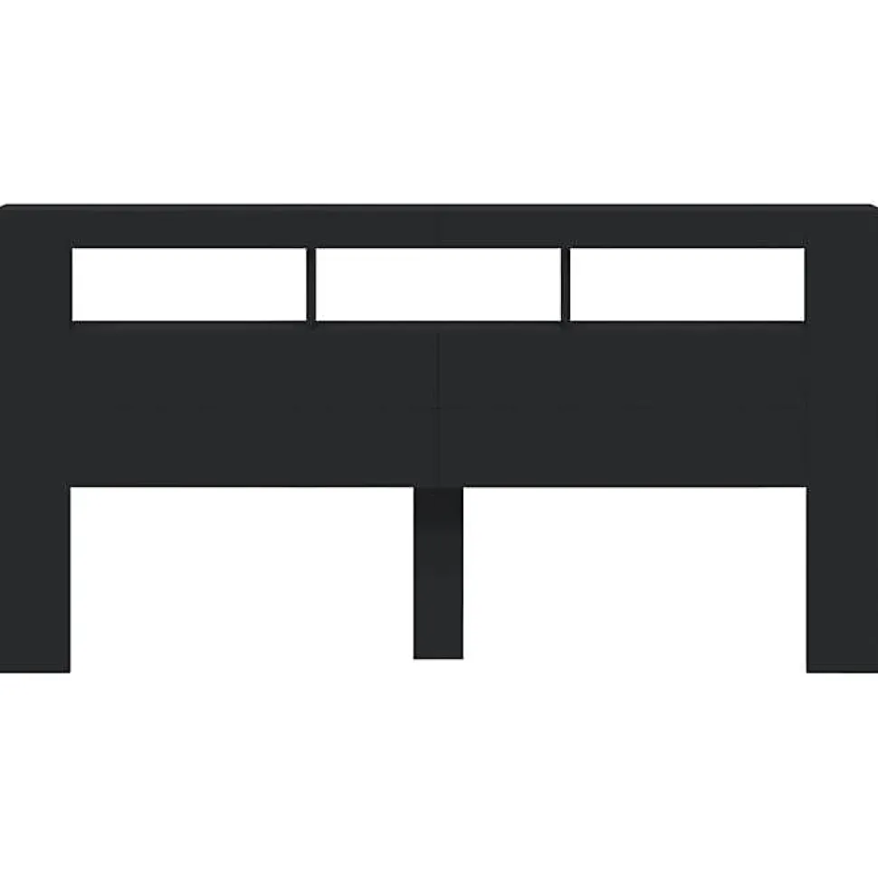 Tête de lit design noire en bois d’ingénierie avec éclairage LED RVB réglable, plateau supérieur et espaces de rangement ouverts. Dimensions 200 x 18,5 x 103,5 cm. Alimentation LED par USB 5V (non incluse). Produit à monter.