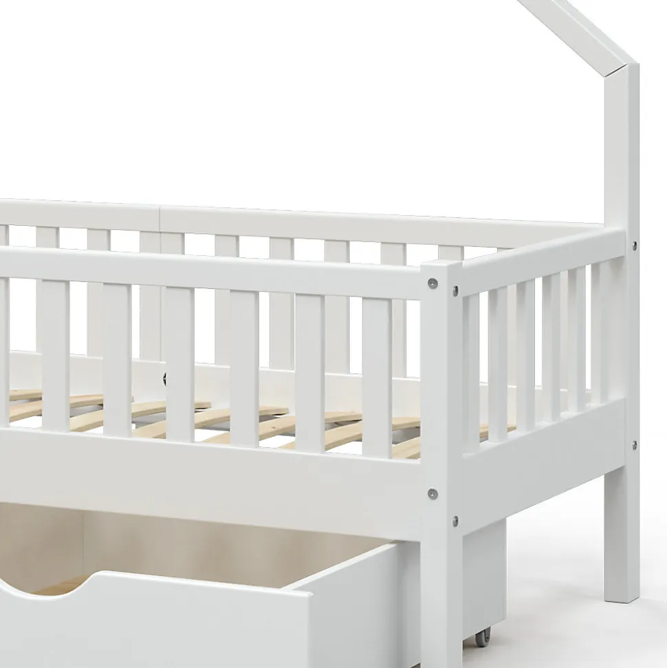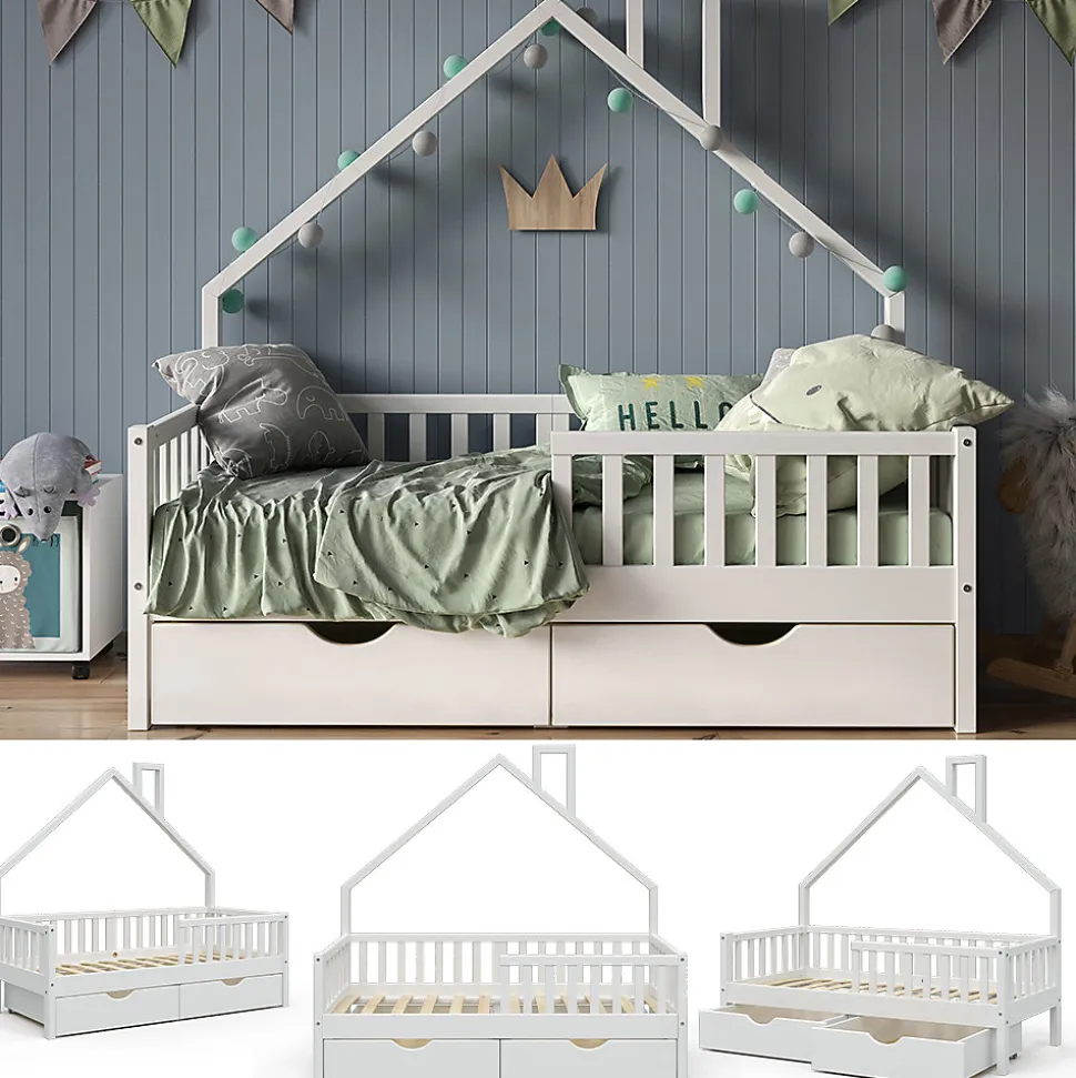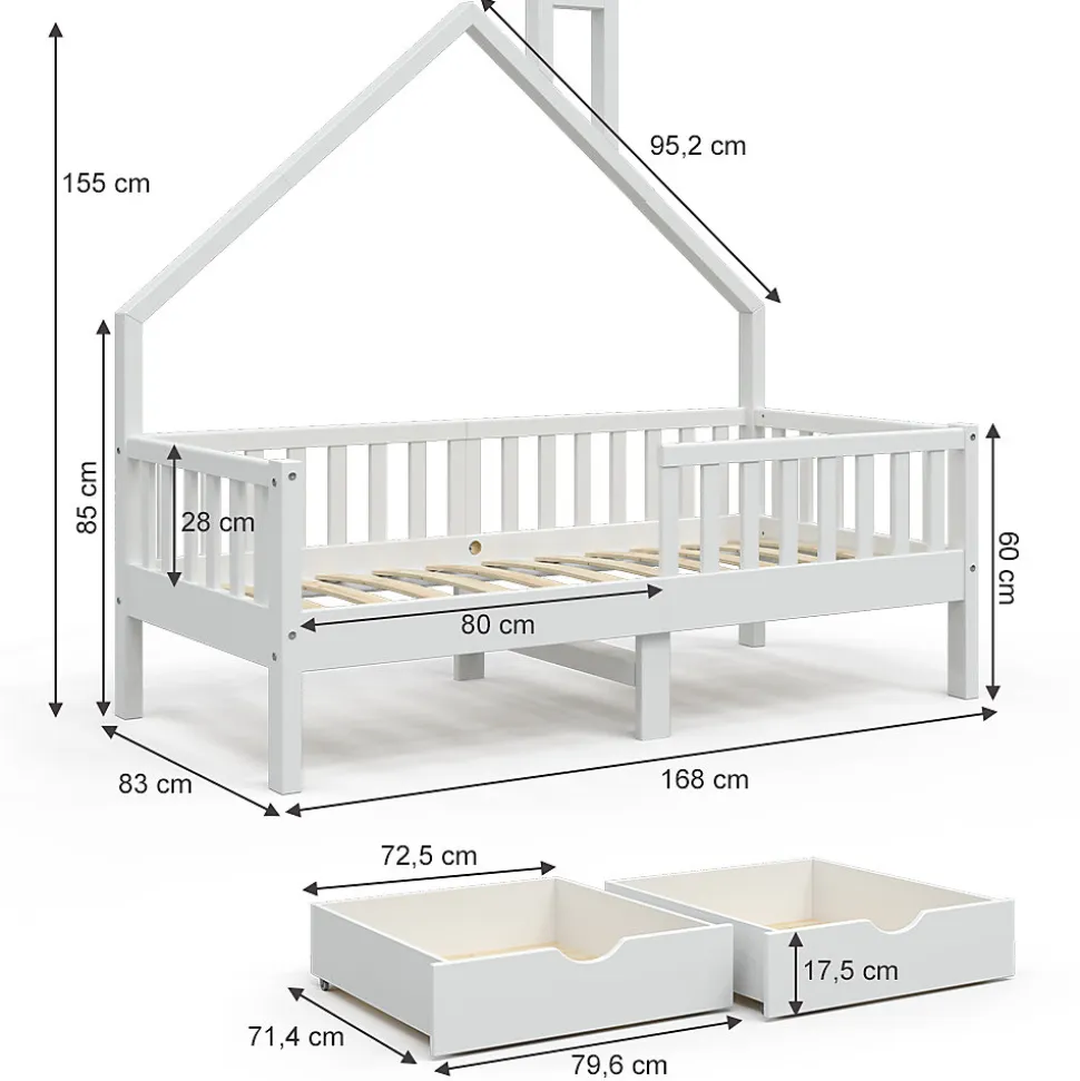 Notre lit en bois pour la chambre d’enfant « Noemi » est une bonne décision pour les parents qui attachent de l’importance à un design optimal et à une utilisation universelle.Le lit en bois permet aux enfants de développer leur imagination et leur créativité dans la chambre d’enfant et constitue un point fort d’une grande qualité.Dimensions : le lit d’enfant est adapté aux matelas de 160 x 80 cm et a une hauteur de 155 cm. Les dimensions détaillées des différentes parties sont indiquées sur les photos.MATÉRIAU : le lit de jeu pour enfants est en pin naturel.LIVRAISON : Lit de maison, instructions de montage, matériel de montage, 2x tiroirs. (Décoration non comprise)