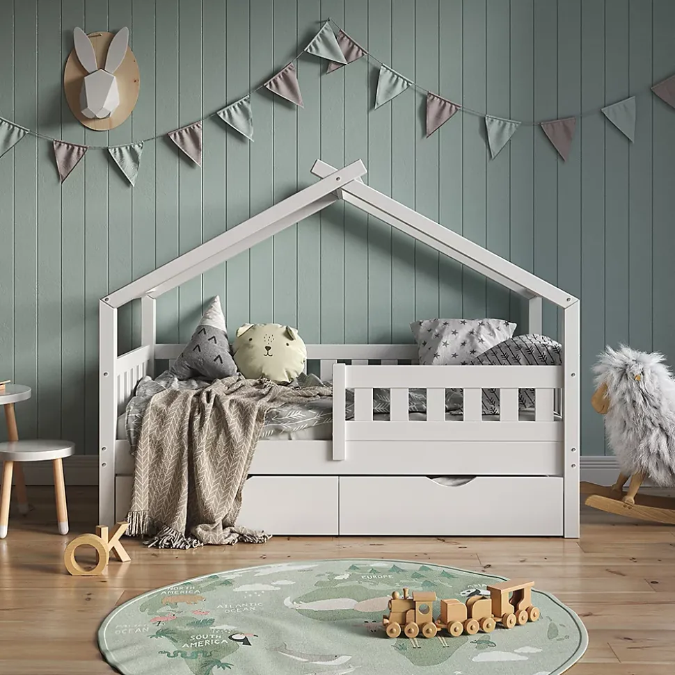 Adapté à la maison et agréable à regarder, notre lit pour chambre d’enfant « Design » offre à la fois confort et style pour votre enfant.Le lit et bois offrent un lieu de jeu et de développement pour les enfants qui stimule leur imagination et leur créativité. La haute qualité de ce lit en fait un élément fort de la chambre.DIMENSIONS : Le Lit enfant convient pour un matelas de80x160 cm et a une hauteur de 133,6 cm. Toutes les tailles détaillées sont indiquées sur les photos.MATÉRIAU: Le lit enfant avec toit est composé de bois de pin naturel.CONTENU DE LA LIVRAISON: Lit de maison, Matelas pour enfants, Instructions de montage, Matériel de montage