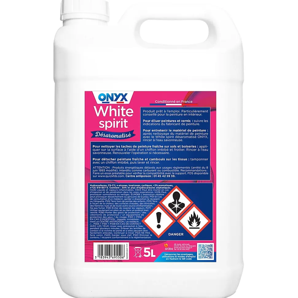 - Le white spirit désaromatisé Onyx est le solvant indispensable pour tous les travaux de peinture.