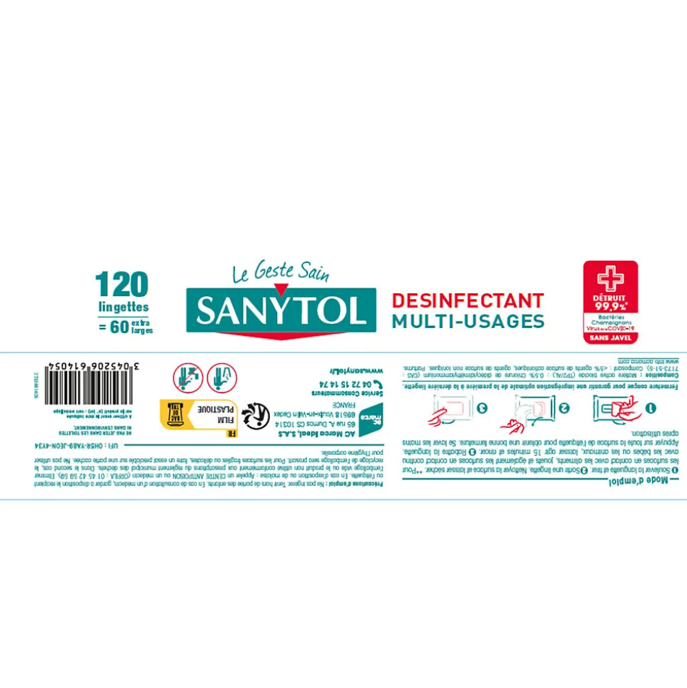 Sanytol – Lingettes désinfectantes multi-usages eucalyptus (120 unités, 0,2 L) Offrez à votre intérieur une propreté irréprochable avec ces lingettes désinfectantes Sanytol, idéales pour nettoyer et désinfecter toutes les surfaces lavables sans javel. Efficaces contre 99,9 % des bactéries, virus et champignons, elles sont testées dermatologiquement, garantissant une utilisation sûre pour toute la famille. Leur parfum eucalyptus laisse une sensation de fraîcheur agréable après chaque utilisation. Prêtes à l’emploi, ces lingettes sont parfaites pour entretenir le plan de travail, le réfrigérateur, les WC, les poignées de porte, les interrupteurs, les poubelles ou encore l’univers de bébé. Chaque paquet contient 120 lingettes jetables, offrant une solution pratique et efficace pour un ménage quotidien. Produit biocide – respecter les précautions d’emploi.