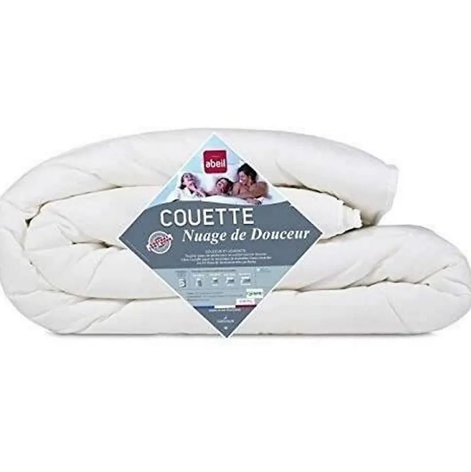 Couette NUAGE de DOUCEUR en microfibre 100% Polyester de coloris blanc. Garnissage : 60% polyester Cyclafill et 40% polyester Airfill. Grammage : 200 gr/m². Piquage : parfil simple. Finition : ganse blanche. Packaging : sachet simple soudé + Encart Abeil. Fabrication Française. Dimensions : 240×260 cm.