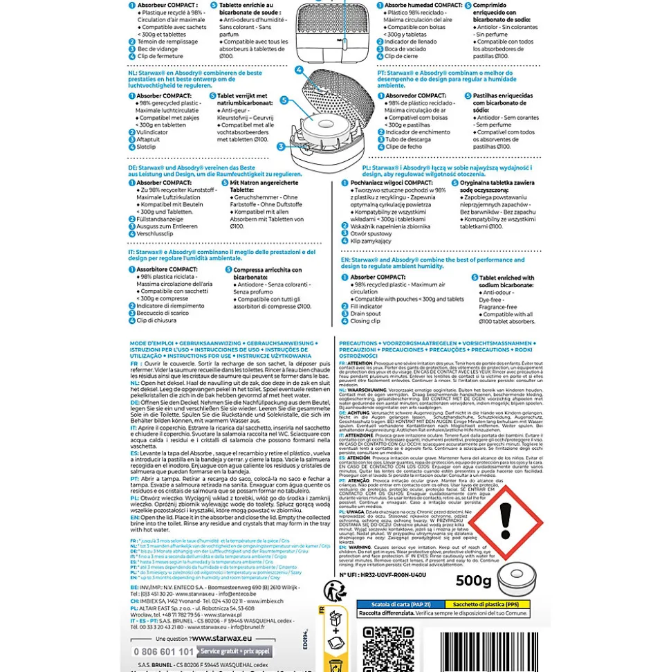 L’absorbeur d’humidité Starwax Absodry est à la fois efficace et discret : son design moderne s’intègre parfaitement dans votre décor, notamment dans les pièces de vie (salon, chambre…), Il est fourni et rechargeable avec 1 galet hyper absorbant à base de chlorure de calcium enrichi au bicarbonate de soude, Le bicarbonate de soude est connu pour son efficacité anti-odeurs, Cette tablette percée capte l’humidité de l’air et la relargue sous forme d’un liquide appelé « saumure » dans le bac inférieur, Elle permet de limiter et de prévenir les conséquence d’un excès d’humidité (moisissures, papier décollé, peinture cloquée, odeurs, froid, effets sur la santé.) L’absorbeur d’humidité Starwax Absodry duo family est pratique grâce à son témoin de remplissage et son bec de vidange, Il est en plastique 96% recyclé et disponible en 2 coloris, 1 Absorbeur permet de traiter env. 15m² jusqu’à 3 mois