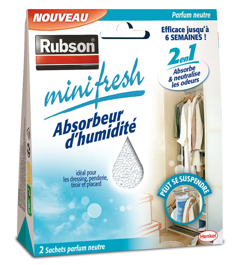 RUBSON Minifresh Absorbeur d’Humidité – Fini l’humidité et les mauvaises odeurs dans vos placards, tiroirs, penderies et voitures ! Les Sachets Minifresh de RUBSON sont de petits absorbeurs d’humidité jetables qui éliminent les mauvaises odeurs de votre intérieur tout en contrôlant l’humidité. Ils sont utilisables dans de petits espaces fermés d’1 à 2 m² comme les penderies, placards, casiers ou rangements à chaussures. Les sachets absorbeurs d’humidité sont 2-en-1. Leurs perles hygroscopiques absorbent l’humidité et la transforment en gel. Elles neutralisent les mauvaises odeurs et assurent un intérieur qui sent bon. Retirez le sachet de son emballage en plastique et placez-le face blanche vers le haut sans le recouvrir. Si vous voulez l’accrocher, retirez le film de l’adhésif et fixez l’attache sur la partie bleue du sachet avant de le suspendre. Les caractéristiques du produit en détail : Absorbe l’humidité et lutte contre les moisissures. Neutralise les mauvaises odeurs. Idéal pour les espaces clos (1 à 2 m²). Sans risque pour vos vêtements et chaussures : l’humidité est transformée en gel. Peut se suspendre parfum neutre. Dangereux. Respecter les précautions d’emploi.