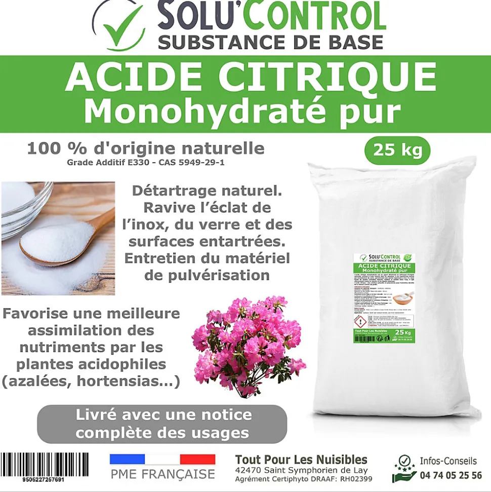 L’acide citrique monohydraté Solu’Control est un produit 100 % d’origine naturelle, obtenu par fermentation de matières premières végétales. Présenté sous forme de poudre cristalline blanche, il est inodore et multifonction, parfait pour l’entretien de la maison, du jardin et du matériel.Véritable allié du nettoyage sain, l’acide citrique permet de remplacer avantageusement de nombreux produits ménagers chimiques. Son efficacité et sa polyvalence en font un indispensable du quotidien.Principaux usages :Détartrant naturel pour bouilloires, cafetières, pommeaux de douche et fers à repasser : diluez 2 à 3 cuillères à soupe dans 1 L d’eau tiède, laissez agir, puis rincez.Raviveur d’inox et de verre : 1 cuillère à soupe pour 1 L d’eau chaude suffit à redonner éclat et brillance.Entretien du lave-linge et du lave-vaisselle : versez 5 à 6 cuillères à soupe dans le tambour, lancez un cycle à vide pour éliminer le calcaire et les résidus.Nettoyant pour brumisateurs et systèmes d’irrigation : 2 à 3 cuillères à soupe par litre d’eau pour dissoudre les dépôts minéraux.Correcteur de pH et soin des plantes acidophiles : 1 g par litre d’eau pour les hortensias, azalées ou camélias, afin de maintenir un pH favorable à leur croissance.Précautions d’emploi :Portez des gants lors de la manipulation et évitez tout contact avec les yeux.Tenir hors de portée des enfants et des animaux.Conserver dans un endroit sec, à l’abri de la chaleur et de l’humidité.Produit non alimentaire, réservé aux usages ménagers, techniques et horticoles.Un geste simple et naturel :Avec Solu’Control, adoptez une alternative économique et efficace pour un entretien sain de votre intérieur. Un seul produit pour tout nettoyer, détartrer et faire briller, dans le respect de l’environnement.