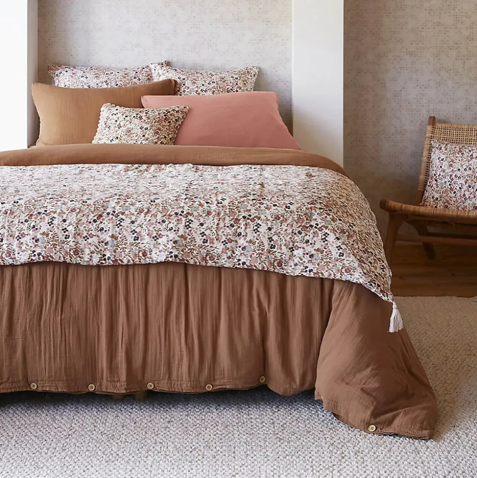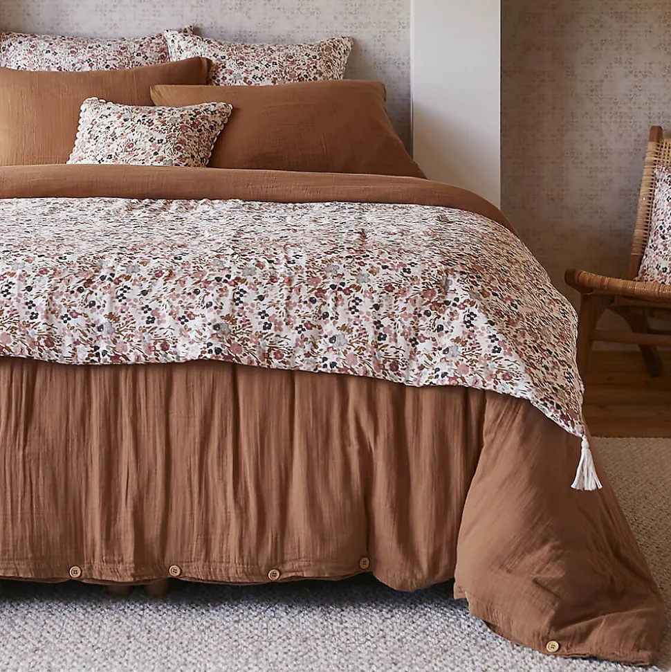 - Chemin de Lit 90x200cm Gaze de Coton Blanc Imprimé Fleur Détail 4 Pompons de la gamme Adonis. Un imprimé foral rafraîssant, en gaze de coton, légère, fluide et confortable.
