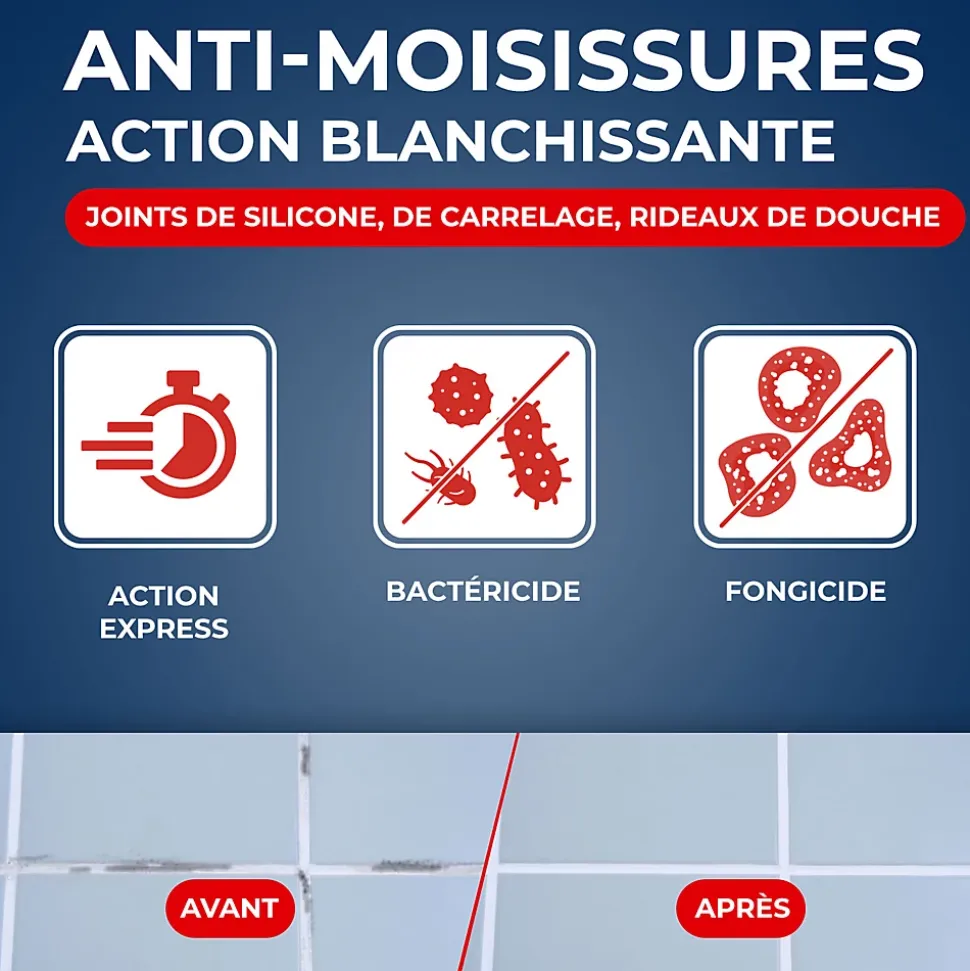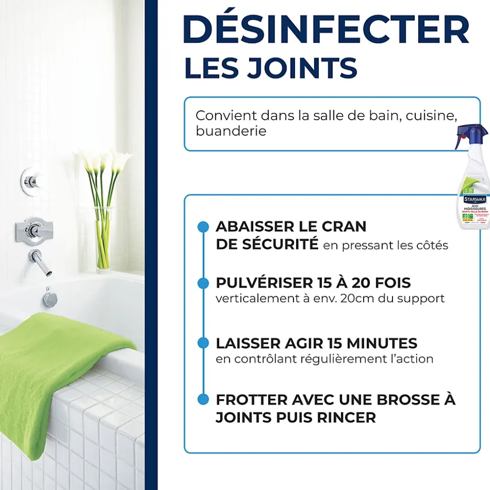 Avec l’anti-moisissures Idéal joints Starwax 500 ml vous allez être séduit par l’efficacité de l’anti-moisissures Starwax : Après pulvérisation et une action de quelques minutes, il détruit les moisissures, élimine les traces noires et désinfecte le support. Grace à sa Formule préventive, il empêchera aussi le développement des bactéries. Appliquer sur les joints (de carrelage ou de silicone), les rideaux de douche,… dans les pièces d’eau ou mal aérées.