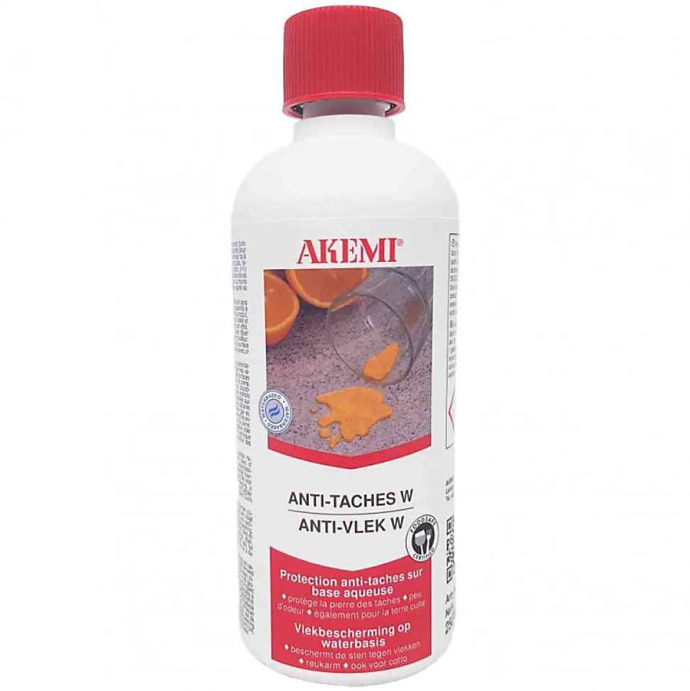 Anti-Taches W – AkemiProduit d’imprégnation permettant d’éviter la pénétration d’eau, de graisse ou d’huile. Protège les sols, les tables et les plans de travail en pierre naturelle et en pierre artificielle (marbre, pierre de Solnhofen, grès, faïence), en intérieur comme en extérieur. Les taches sont évitées ou sont plus faciles à éliminer; la pierre respire. A faible teneur en solvants et peu odorant, ce produit convient parfaitement à une utilisation dans les pièces occupées.Produit parfaitement adapté pour être appliqué sur des supports humides.Caractéristiques : Une absorption d’eau amoindrie sous l’action de l’humiditéUn effet répulsif vis-à-vis des huiles et des graissesUne diminution de l’adhérence des peintures sur les surfaces traitées (effet anti – graffiti)Conservation de la capacité de respirer de la pierreNe jaunit pasPas de couche sur les surfacesMise en œuvre facileNe colle pas pendant le séchagePeu d’odeurNettoyage facile des appareils avec de l’eauLe produit ne présente donc aucun danger en cas de contact avec les aliments après durcissement ; homologué par un centre de recherches externe AllemandClasse d’émission A+ (confirmé par un centre de recherches externe)Réaction de l’efficacité (20°C): 1-2 heuresRendement : env. 5 à 15 m²/litre suivant le pouvoir absorbant et la nature de la surface.Utilisation : Nettoyage Les surfaces doivent être propres et sans couches de cire ou autres produits. A l’extérieur, vérifier que les pierres ne contiennent pas de sels nocifs (nitrate, sulfate, chlorure) car ceux-ci empêchen