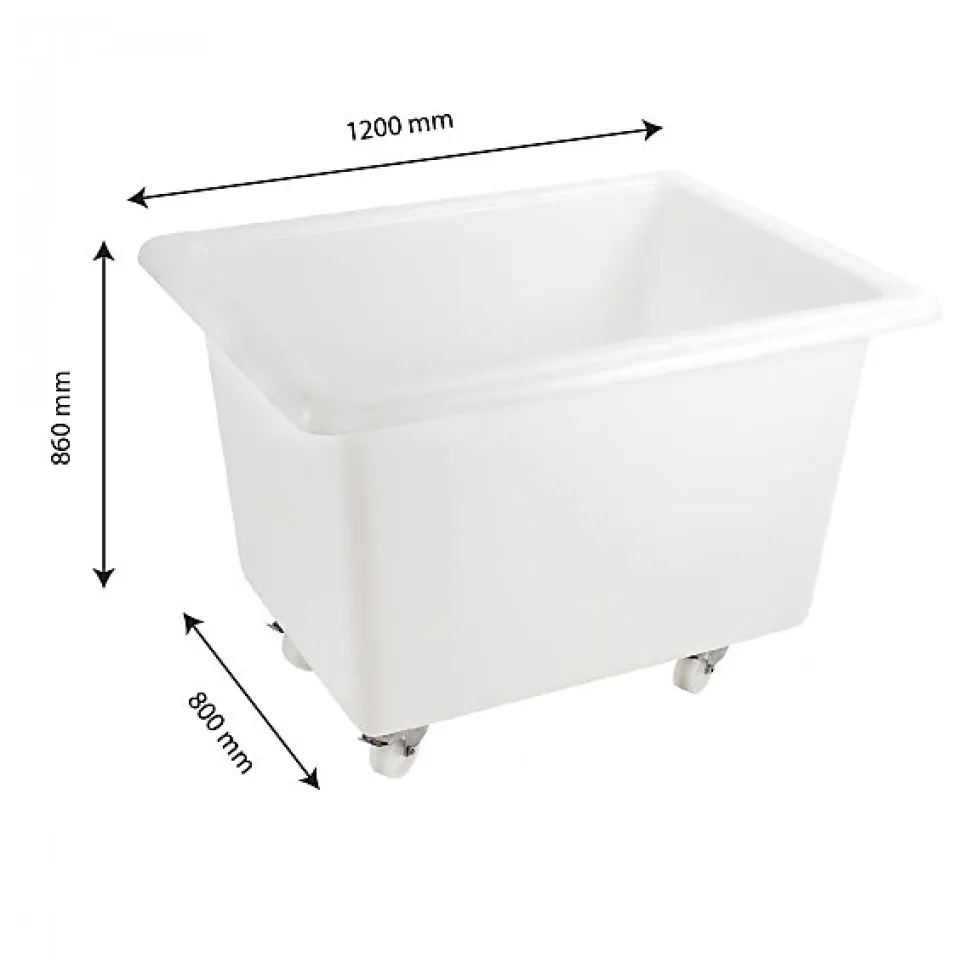 La solution économique pour déplacer simplement les bacs grands volumes.Roues et visseries Inox. Acier Inoxydable recommandé en environnements humides (aucune altération des roulements même en présence d’eau).Résistance à la charge : 300 kg, donnée à titre indicatif (dépend de la répartition de la charge et de la température d’utilisation).Joints présents sur l’axe de fixation des roues pour une étanchéité parfaite.Le litrage indiqué correspond au bac rempli à ras bord. Hauteur : 985 mm Largeur : 800 mm Longueur : 1200 mm Contenance : 500 L Matière : PEHD Longueur intérieure bas produit : 920 mm Largeur intérieure bas produit : 510 mm Hauteur intérieure bas produit : 845 mm Résistance à la charge : 300 kg Poids : 24,5 kg