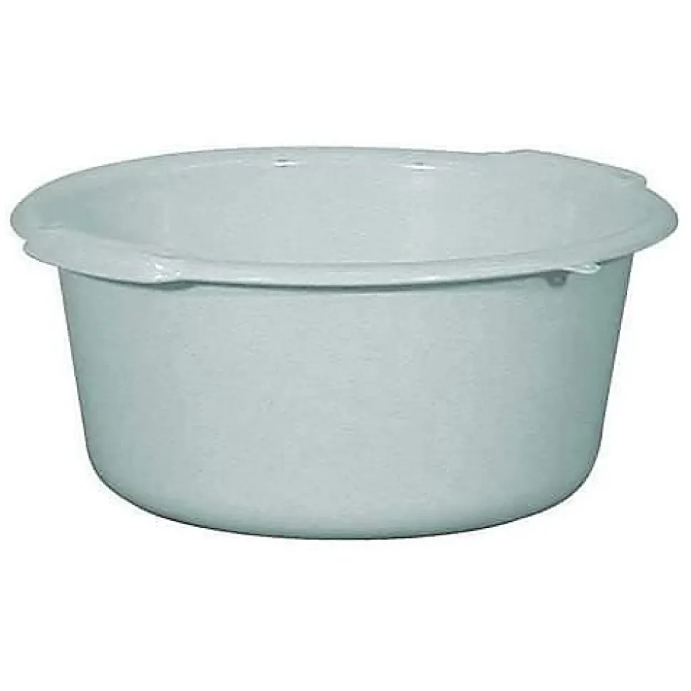 Bassine ronde 14 L (Ø 42 × H 17 cm) en plastique gris moucheté, dotée de deux poignées intégrées et de parois coniques empilables pour un rangement facile ; idéale pour les usages ménagers et le nettoyage. Réf. 653675.