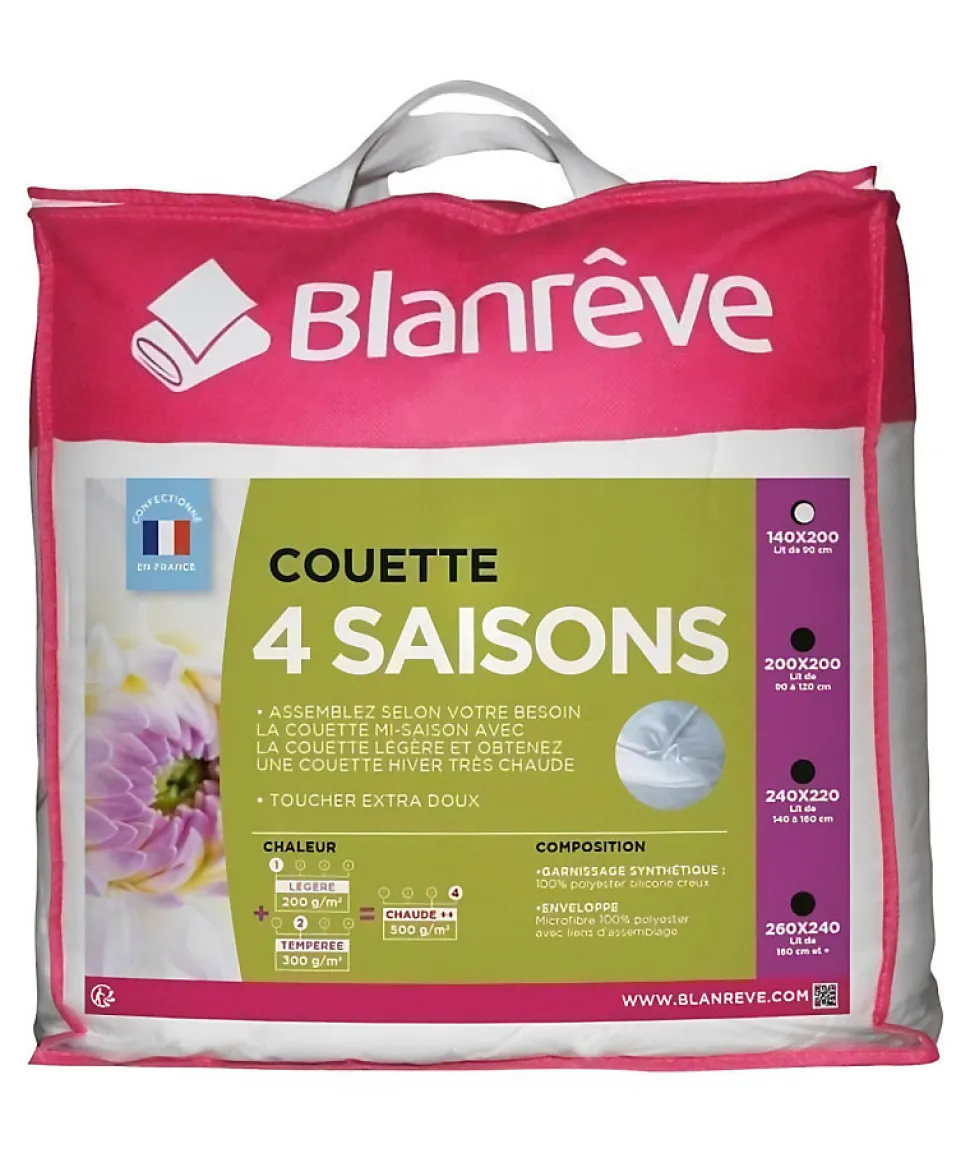 La couette 4 saisons BLANREVE allie confort et adaptabilité pour toutes les saisons grâce à son garnissage en polyester siliconé creux et son enveloppe en microfibre doux au toucher, idéale pour un sommeil paisible et réparateur toute l’année.