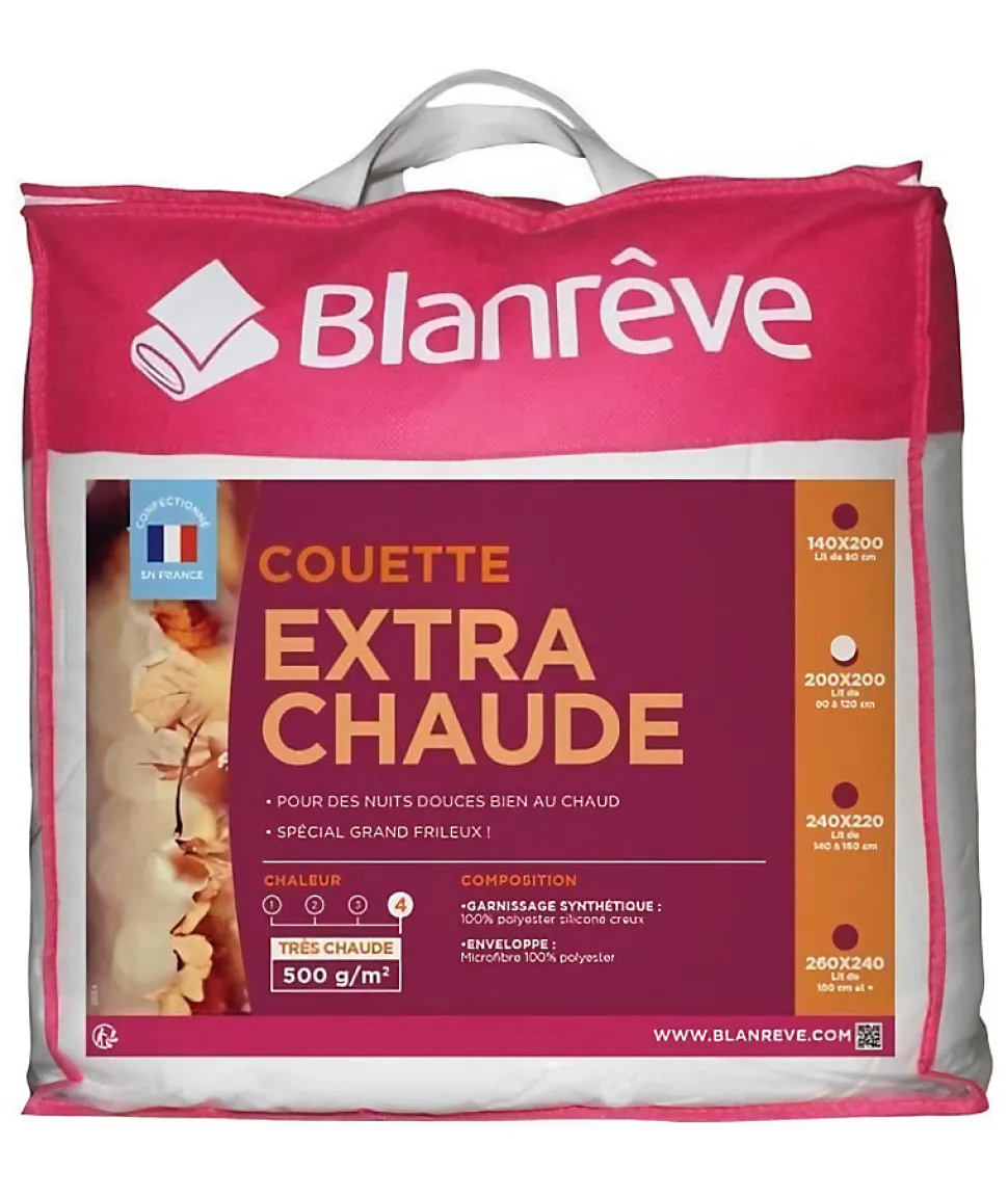 Couette extra chaude en microfibre – 200 x 200 cm – Enveloppe : microfibre 100% polyester – Garnissage : 100% polyester fibre creuse siliconée 500g/m² – Piquage Longiligne – Finition Biais – Coloris : blanc – Livrée dans une valise.