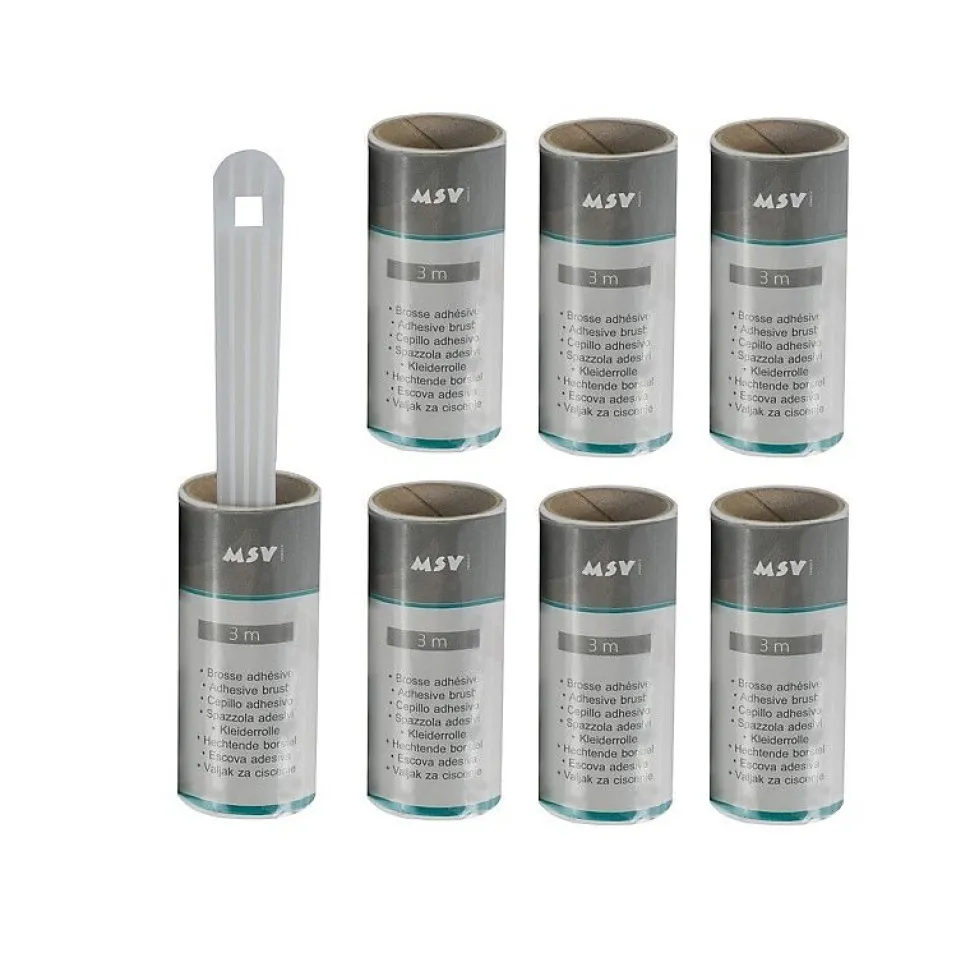 Brosse rouleau adhésive à vêtements de la marque MSV. Débarrassez vous en un claquement de doigt des poussières, des poils d’animaux et des fines particules sur vos vêtements. Jusqu’a 3M d’utilisation +6 rouleaux de recharge! un accessoire indispensable de longue durée qui facilitera votre quotidien! Dimensions: Ø5x20cm Matière: Polypropylène et papier adhésif