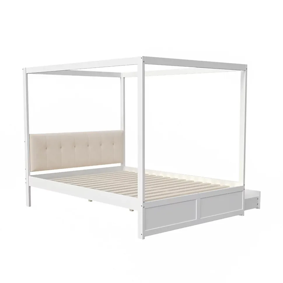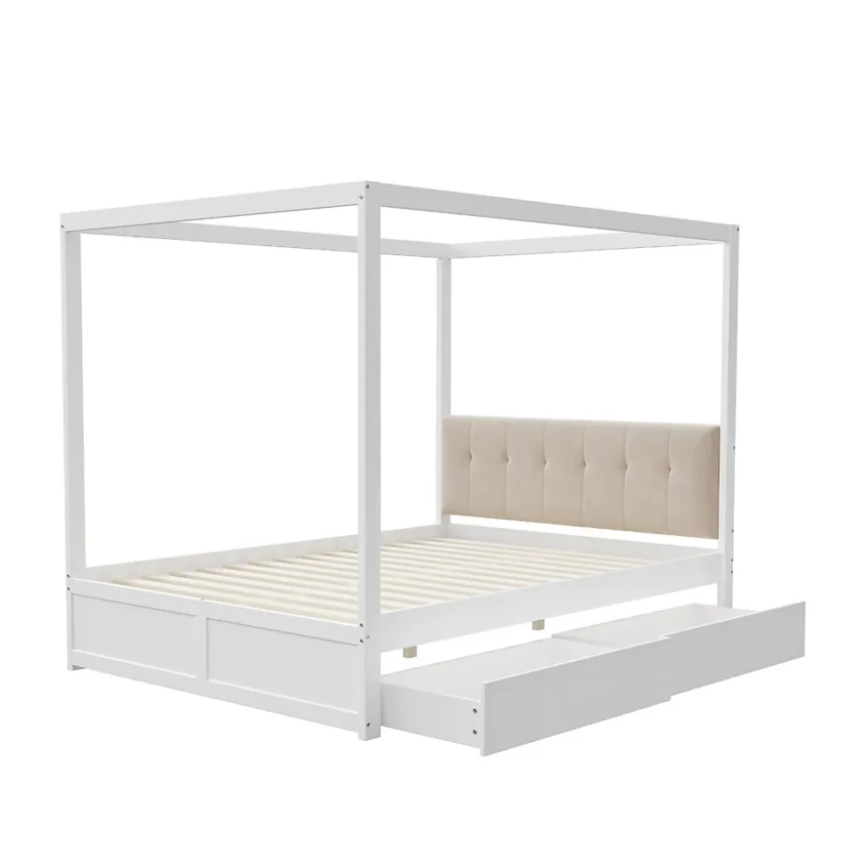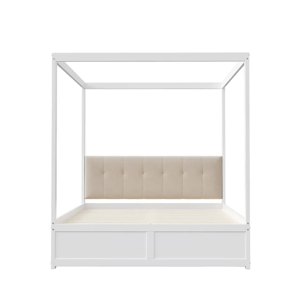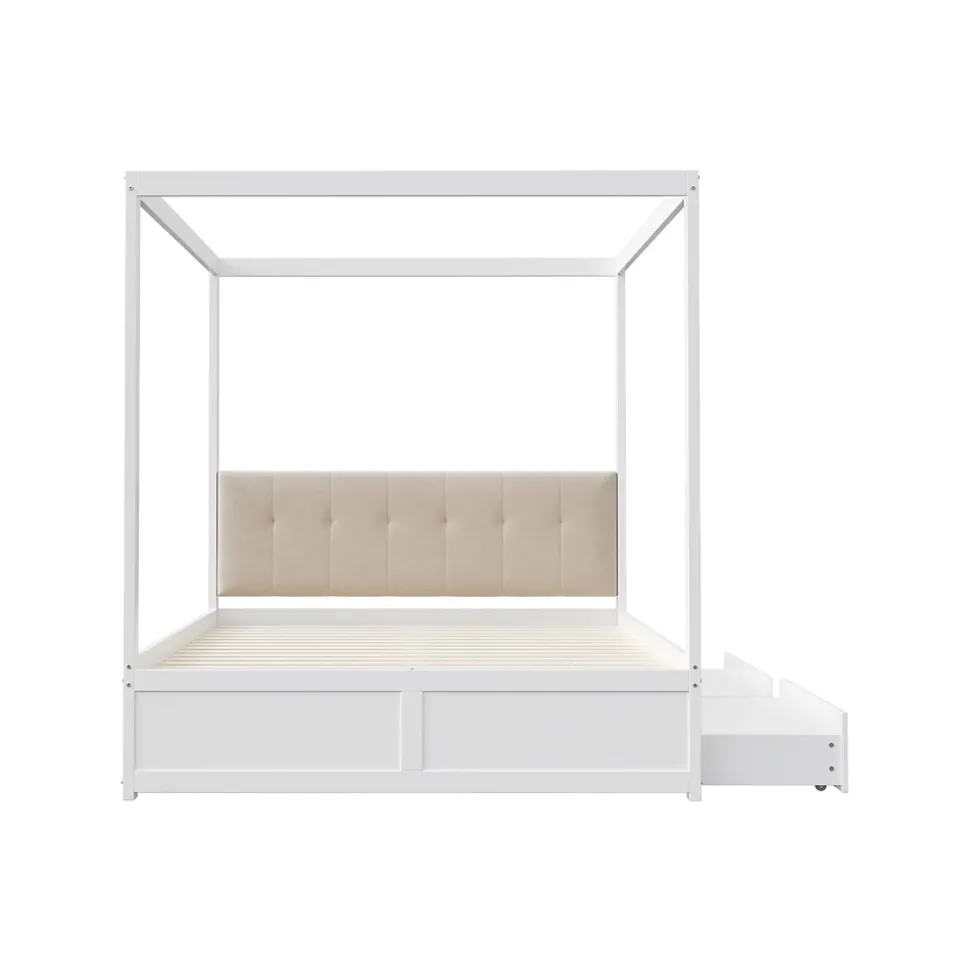 Conception Lit tente 140×200 cm avec rangement et dossier rembourré – BlancApportez confort, praticité et style à la chambre de votre enfant avec ce lit tente élégant et fonctionnel. Sa structure originale en forme de tente peut accueillir une moustiquaire pour protéger des moustiques ou être décorée avec des guirlandes lumineuses, créant un espace ludique et charmant.Caractéristiques principales :Dossier rembourré confortable : Le dossier doux et durable offre un soutien optimal pour lire, jouer ou se détendre.Rangement pratique : Deux tiroirs spacieux sous le lit permettent de ranger jouets, livres, vêtements et linge de lit, aidant à garder la chambre propre et organisée.Design élégant et intemporel : La finition blanche lisse s’intègre parfaitement dans tous les styles de décoration et apporte une touche sophistiquée à la pièce.Structure robuste et durable : Fabriqué en métal, MDF et contreplaqué de haute qualité, ce lit offre un support fiable et une longue durée de vie.Montage facile : Toutes les pièces et outils sont inclus pour un assemblage simple et rapide (environ 1 heure).Poids et dimensions :Dimensions hors tout : 204 x 142 x 160 cmNombre de colis : 2Poids total : 50 kgCapacité de charge : 200 kgÉpaisseur de matelas recommandée : 10-12 cmNombre de lattes : 12Informations complémentaires :Type de produit : Lit modulaireAssemblage complet requisOutils supplémentaires : Inclus (tournevis)Évitez l’utilisation d’outils électriques pour le montage