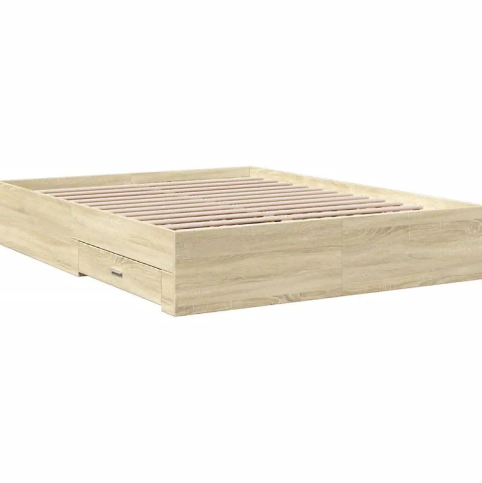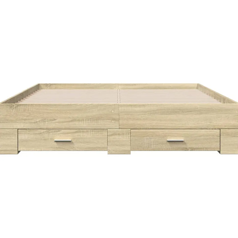 Ajoutez une touche moderne à votre chambre à coucher avec ce cadre de lit avec tiroirs ! Il apportera une touche pratique et décorative à votre espace de vie. Matériau durable : le cadre de lit est fabriquée en bois d’ingénierie. Le bois d’ingénierie est d’une qualité exceptionnelle avec une surface lisse et présente également de la résistance, de la stabilité et de la résistance à l’humidité.Lattes robustes : les lattes de contreplaqué assurent une bonne répartition du poids, garantissant que le matelas reste en place à chaque torsion de votre corps pendant le sommeil.Fonction de rangement : les tiroirs de lit inclus offrent suffisamment d’espace de rangement pour ranger vos articles essentiels, gardant votre pièce propre et bien rangée. Bon à savoir :Un matelas n’est pas inclus avec ce lit. Nous offrons une sélection variée de matelas. Vous pouvez consulter notre boutique pour trouver un matelas assorti. Couleur : chêne sonomaMatériau du cadre de lit : bois d’ingénierieMatériau des lattes : contreplaquéDimensions totales : 203 x 163 x 32 cm (L x l x H)Dimensions du matelas correspondant : 160 x 200 cm (l x L) (matelas non inclus)Dimensions des tiroirs de lit (L) : 81,5 x 31,5 x 13,5 cm (L x l x H)Dimensions des tiroirs de lit (S) : 61,5 x 31,5 x 13,5 cm (L x l x H)Assemblage requis : ouiLa livraison contient :1 x cadre de lit2 x tiroir de lit (L)2 x tiroir de lit (S)Couleur : chêne sonomaMatériau du cadre de lit : bois d’ingénierieMatériau des lattes : contreplaquéDimensions totales : 203 x 163 x 32 cm (L x l x H)Dimensions du matelas correspondant : 160 x 200 cm (l x L) (matelas non inclus)Dimensions des tiroirs de lit (L) : 81,5 x 31,5 x 13,5 cm (L x l x H)Dimensions des tiroirs de lit (S) : 61,5 x 31,5 x 13,5 cm (L x l x H)Assemblage requis : ouiLa livraison contient :1 x cadre de lit2 x tiroir de lit (L)2 x tiroir de lit (S)